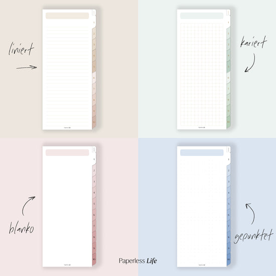 Wähle die Lineatur, die zu deinem Stil passt: Liniert, Blanko, Gepunktet oder Kariert.