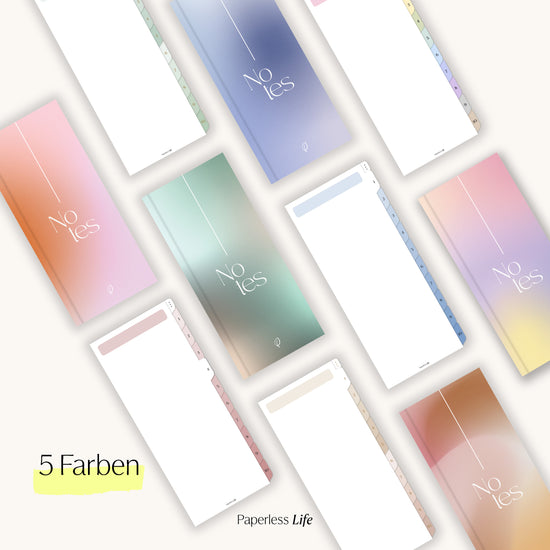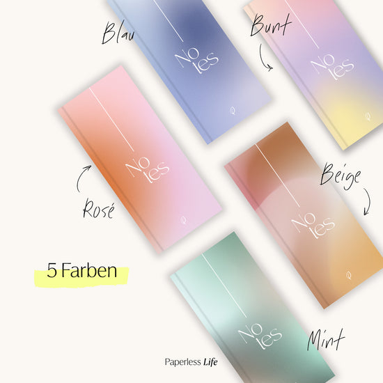 Das Notizbuch ist in den folgenden Farbtönen verfügbar: Beige, Blau, Mint, Pastell und Rosa.