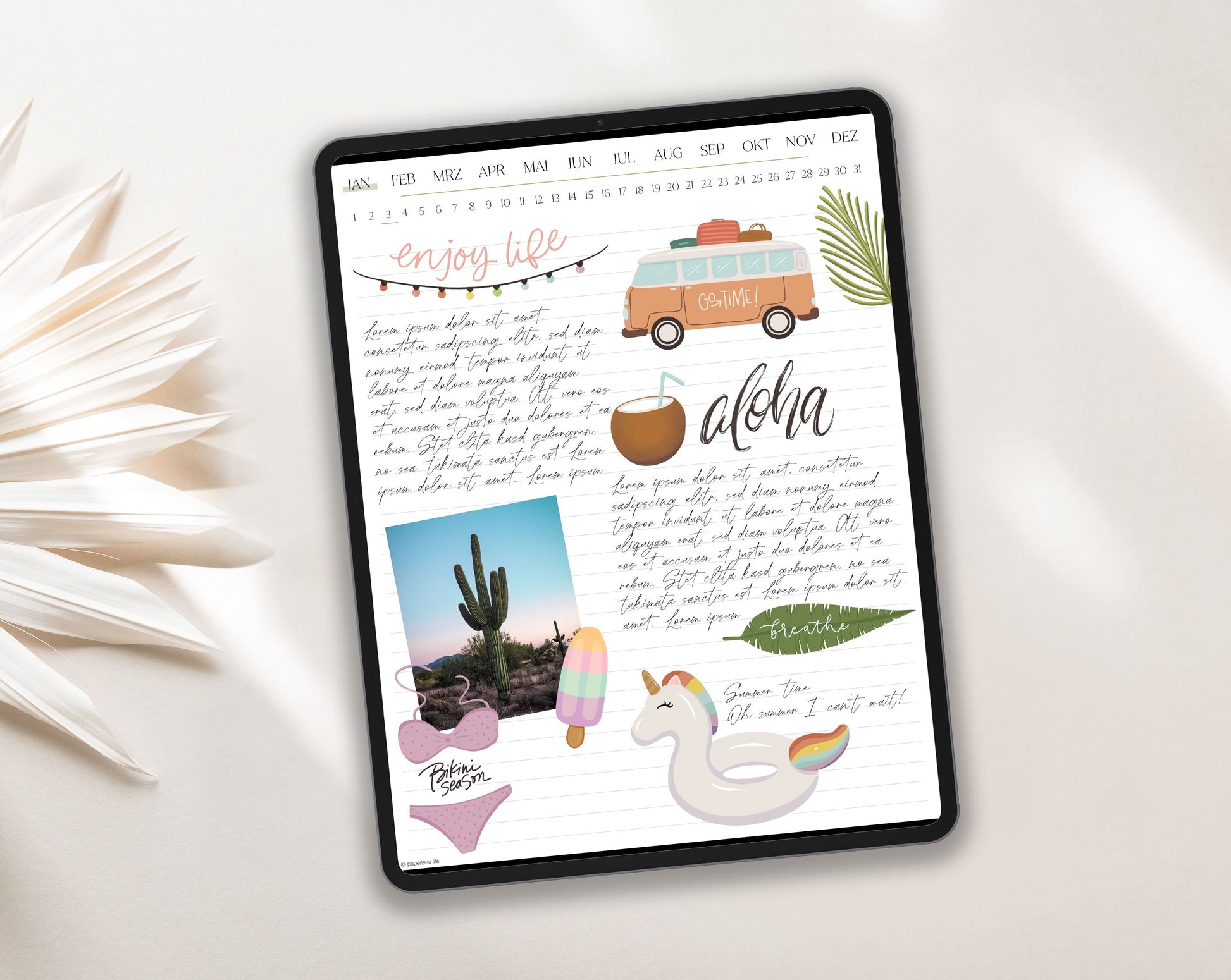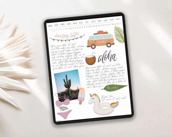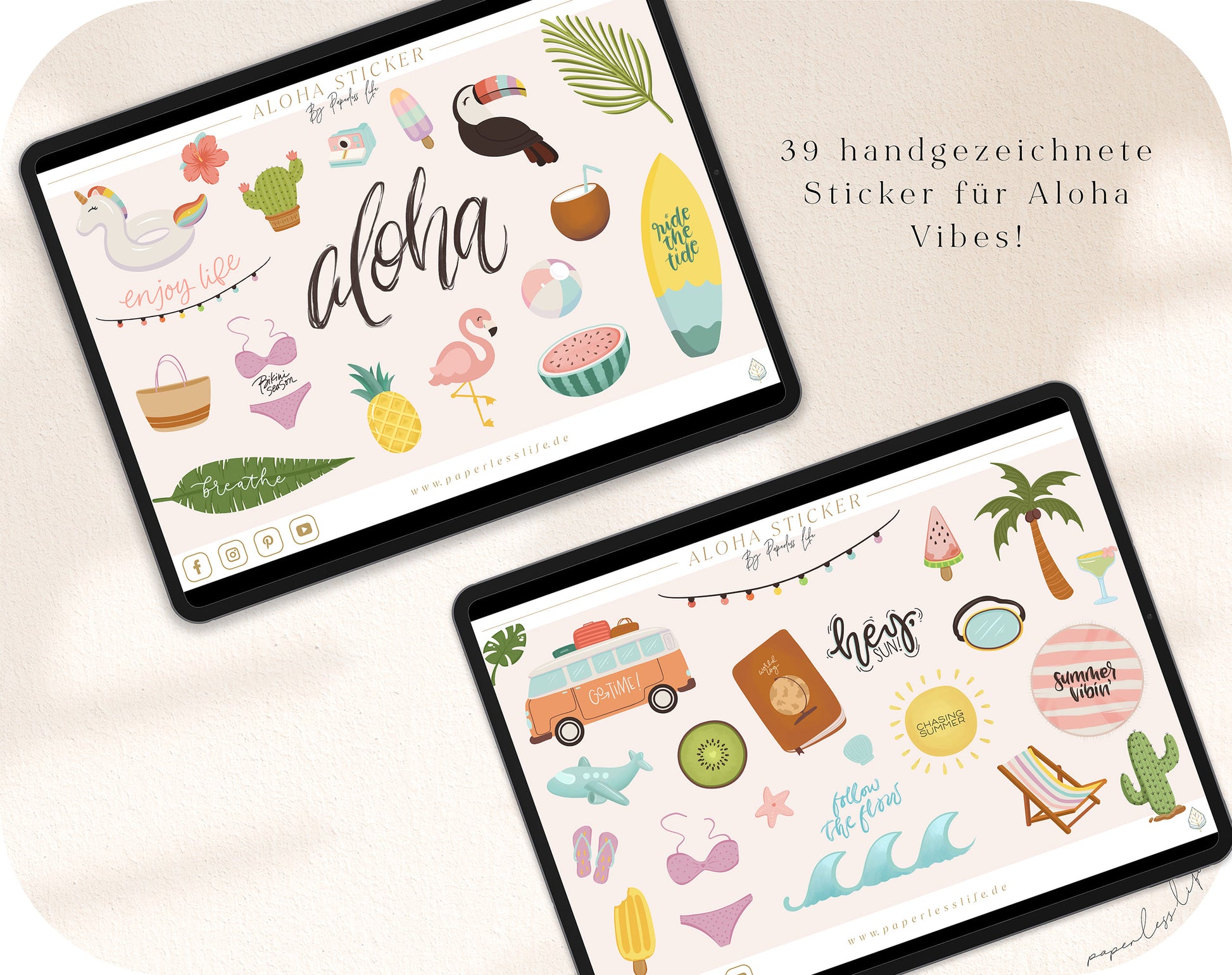 Bring summer into your digital planner with these ALOHA digital stickers! You'll receive a file with stickers tailored specifically for GoodNotes, which you simply copy and paste using the lasso tool. You can also use the stickers with any other note-taking app. Use the stickers for your Instagram Story, too, and spread some summer vibes!