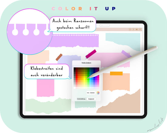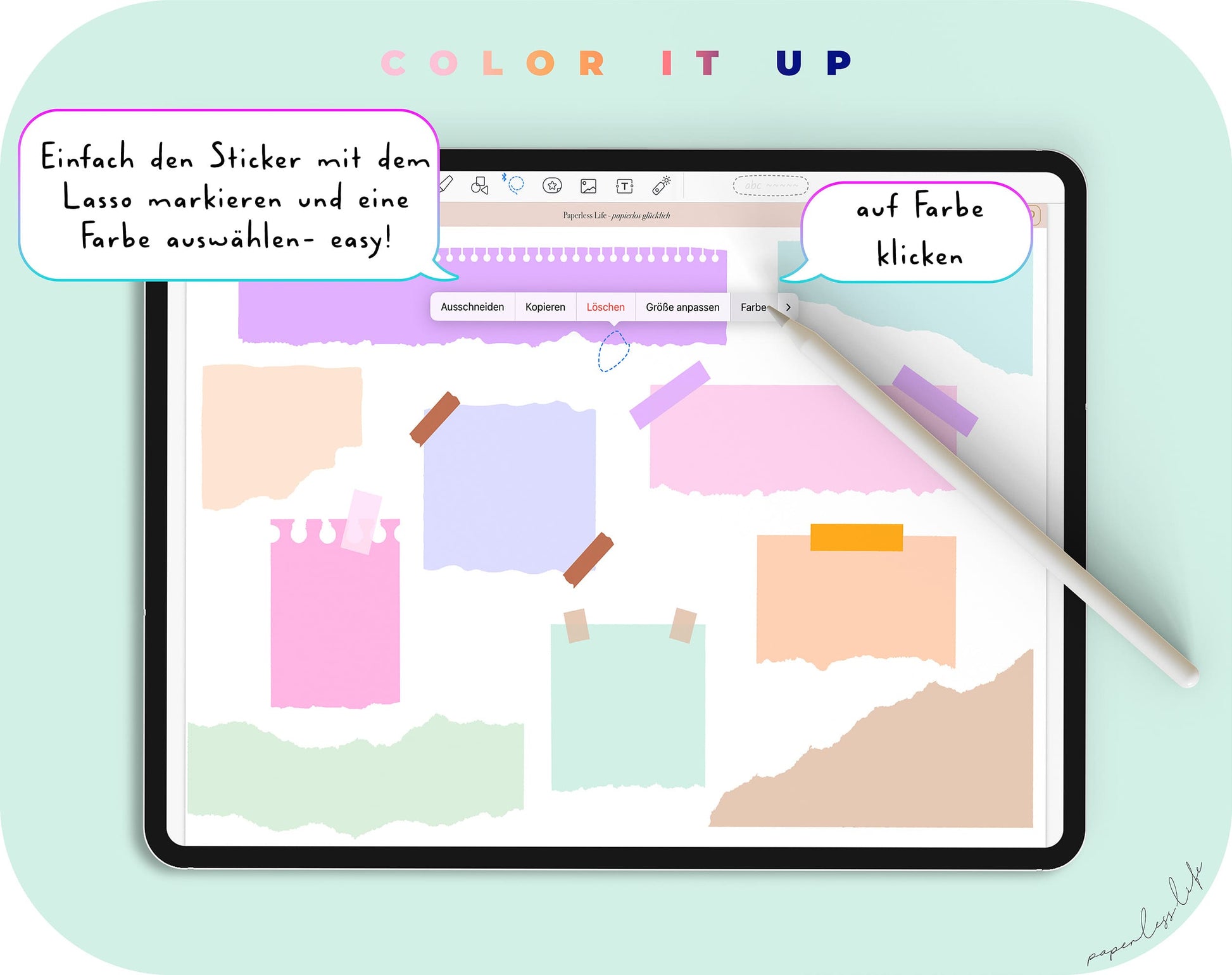 Upgrade your digital planner with this stylish set of Goodnotes torn paper stickers! You can change the color of the note paper and the tape – total customization at your fingertips.
