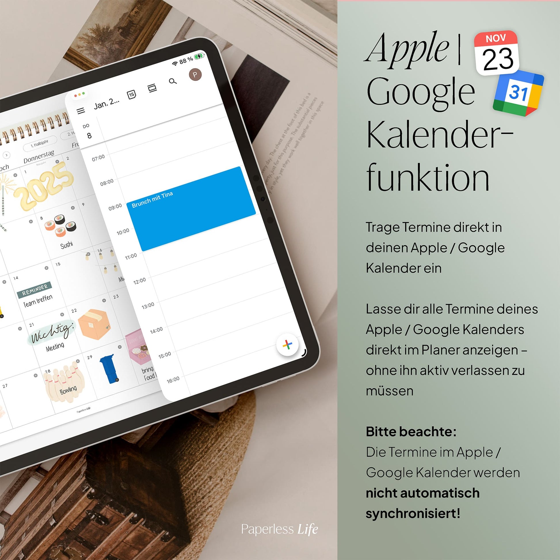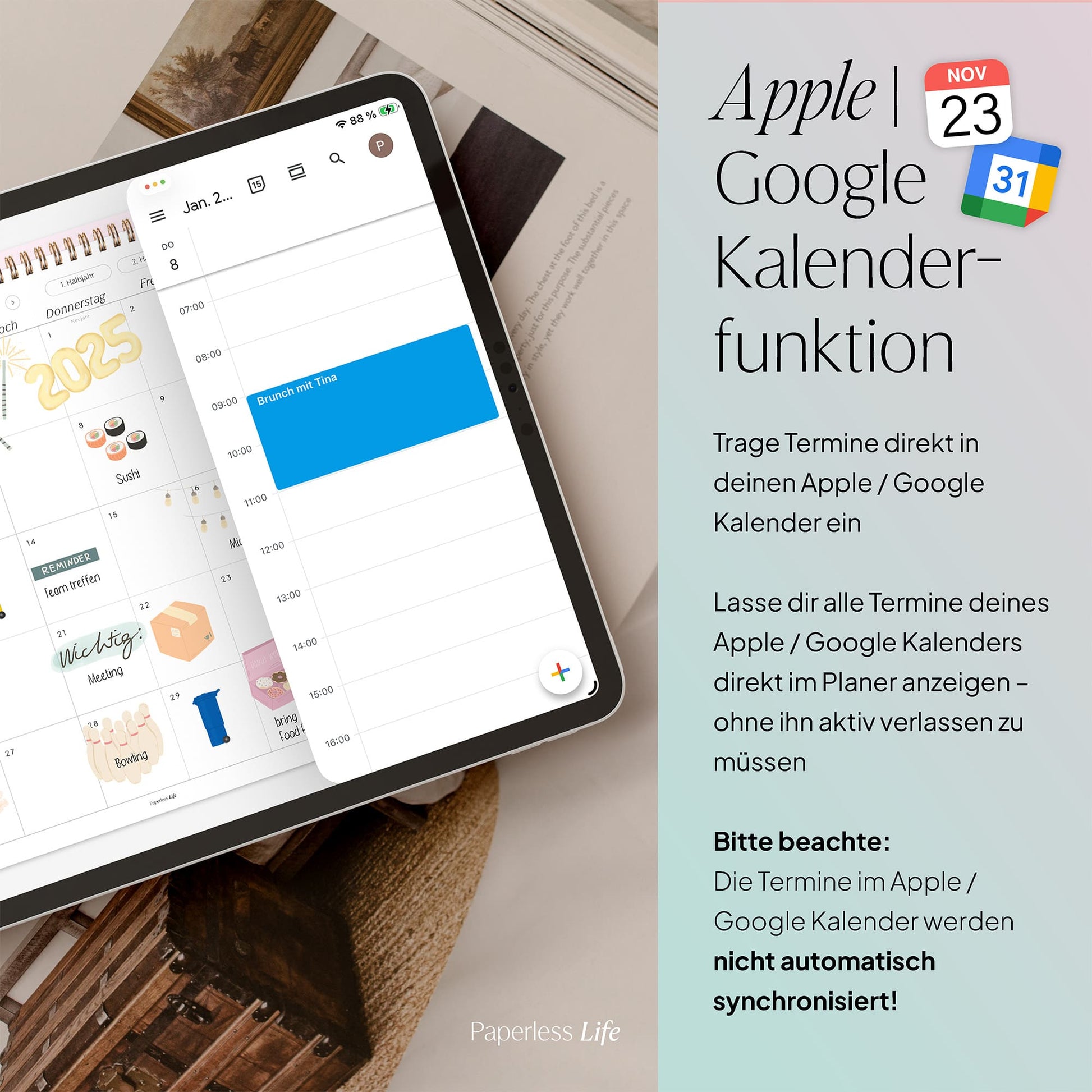 Here's how the calendar feature works: Create an appointment for your Apple Calendar directly in the digital planner or add a new task to the Reminders app. View all upcoming appointments and tasks in the digital planner.