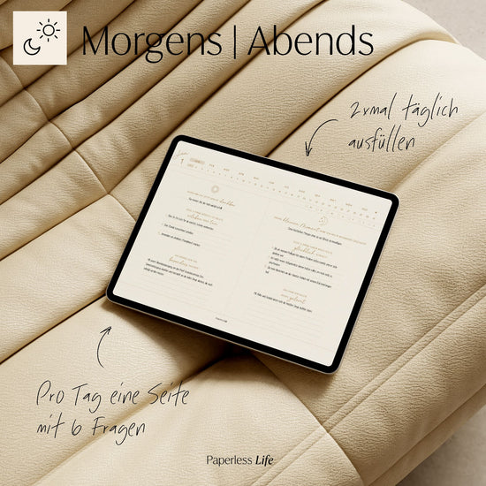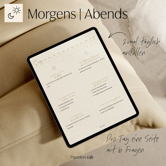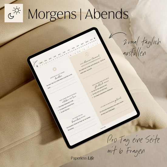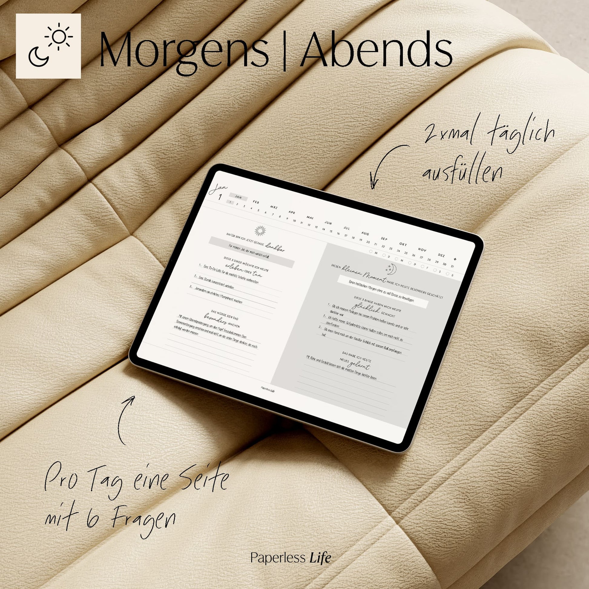 ☀️🌙 Morning and evening - The gratitude journal offers one page per day with six questions: three questions to start the day with positive energy and three questions for reflection in the evening. It's minimalist and, above all, perfect for your "gratitude on the go."