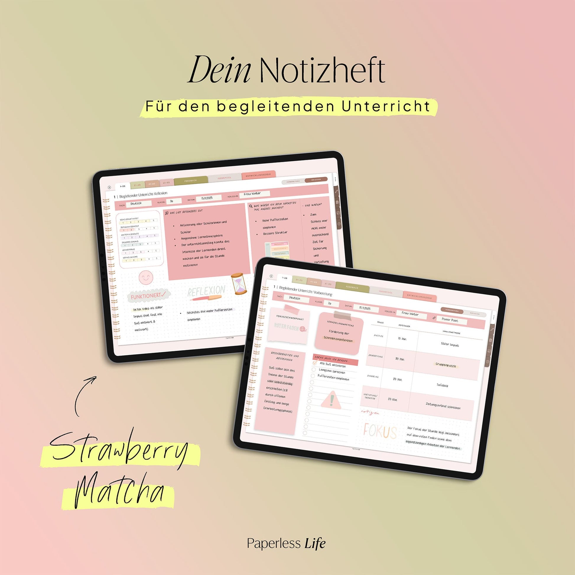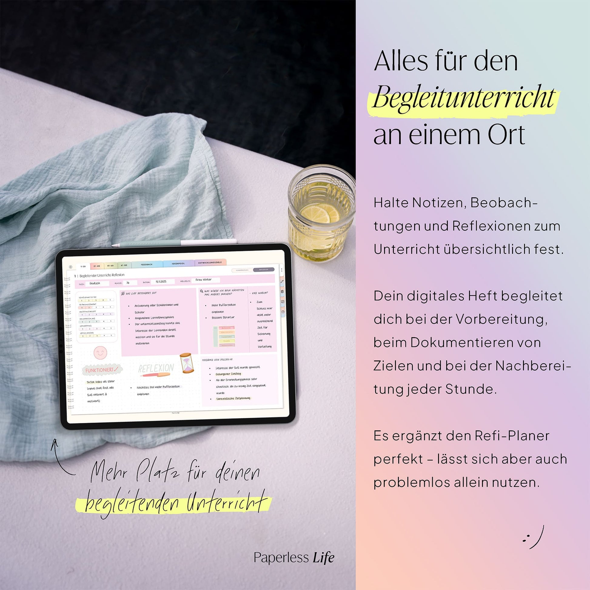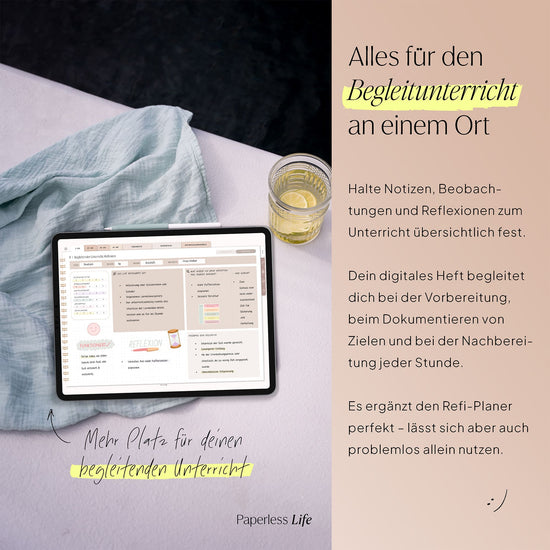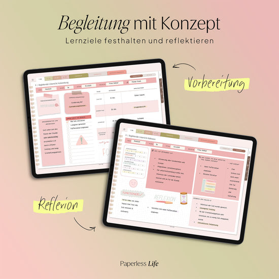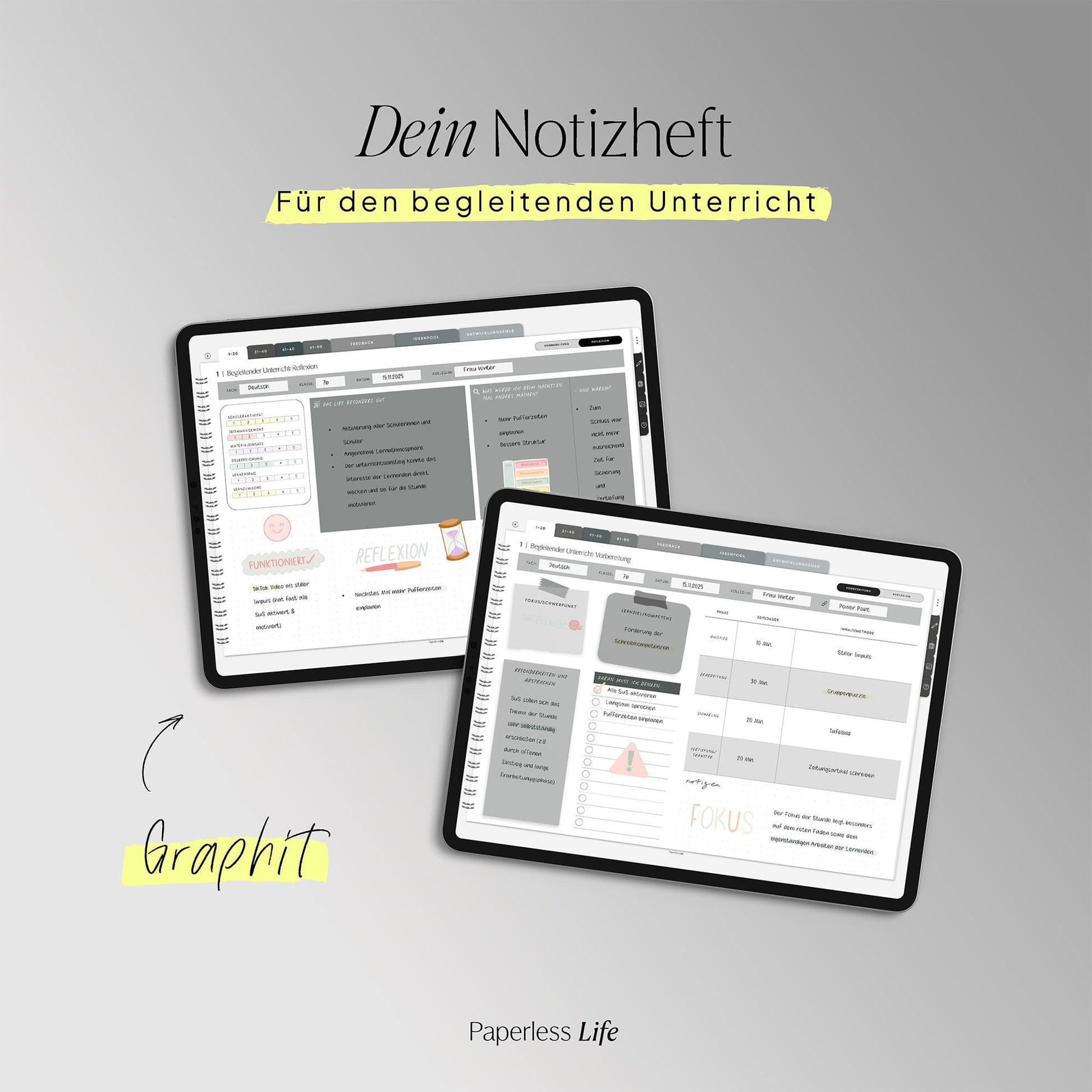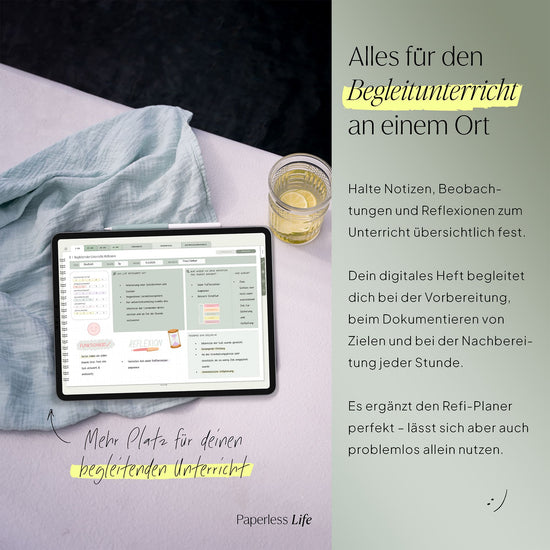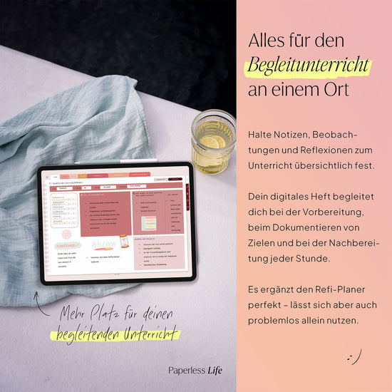 Das digitale Notizbuch für den begleitenden Unterricht bietet dir 80 Seiten, um deine Stunden übersichtlich zu dokumentieren. Jede Stunde erhält dabei zwei Doppelseiten: eine für die Vorbereitung und den Ablauf – und eine für deine persönliche Reflexion.
