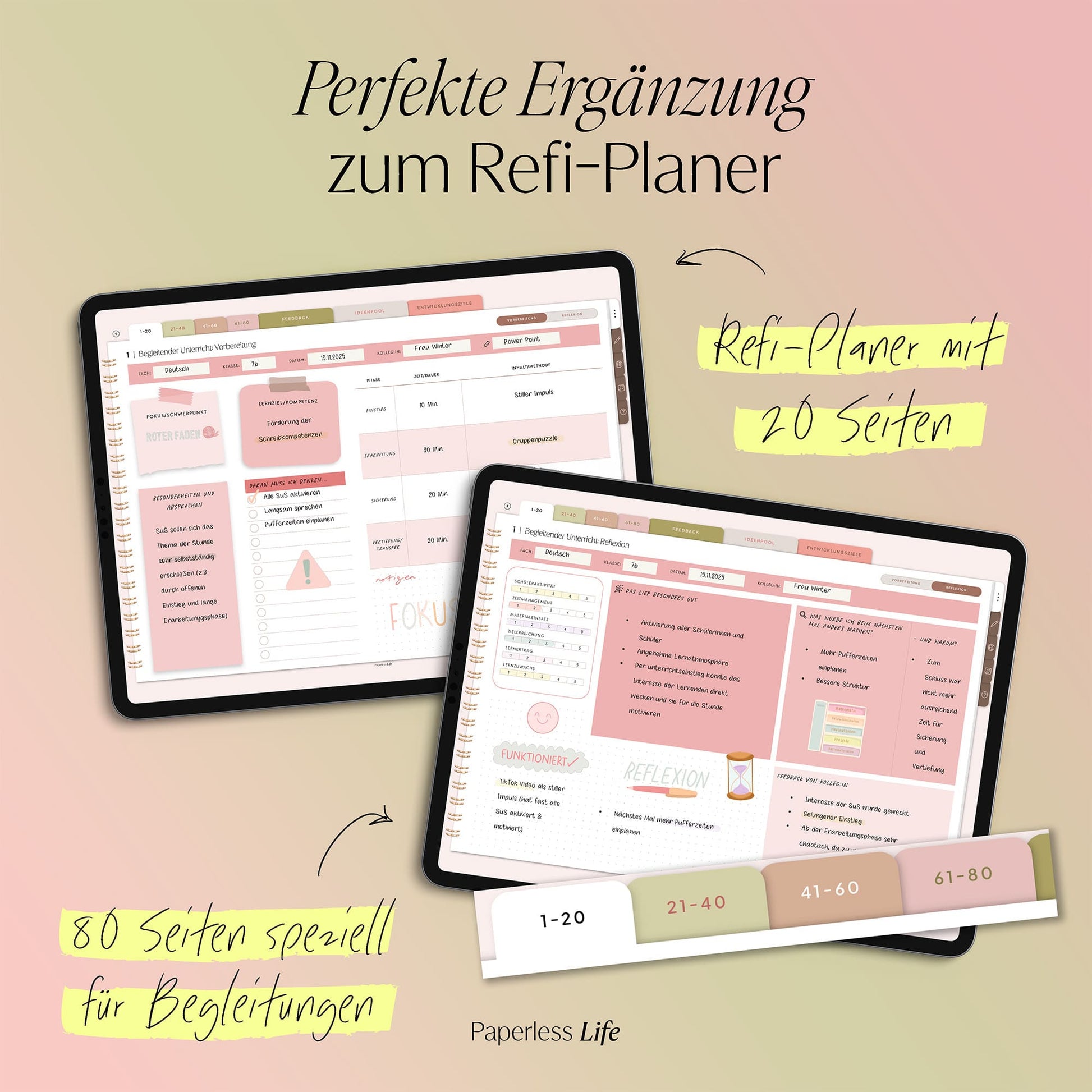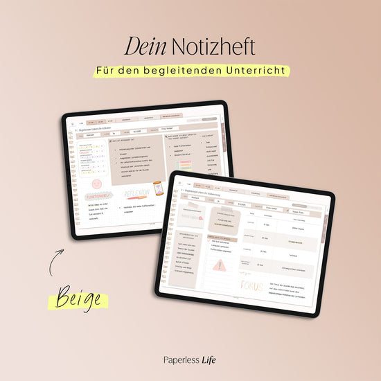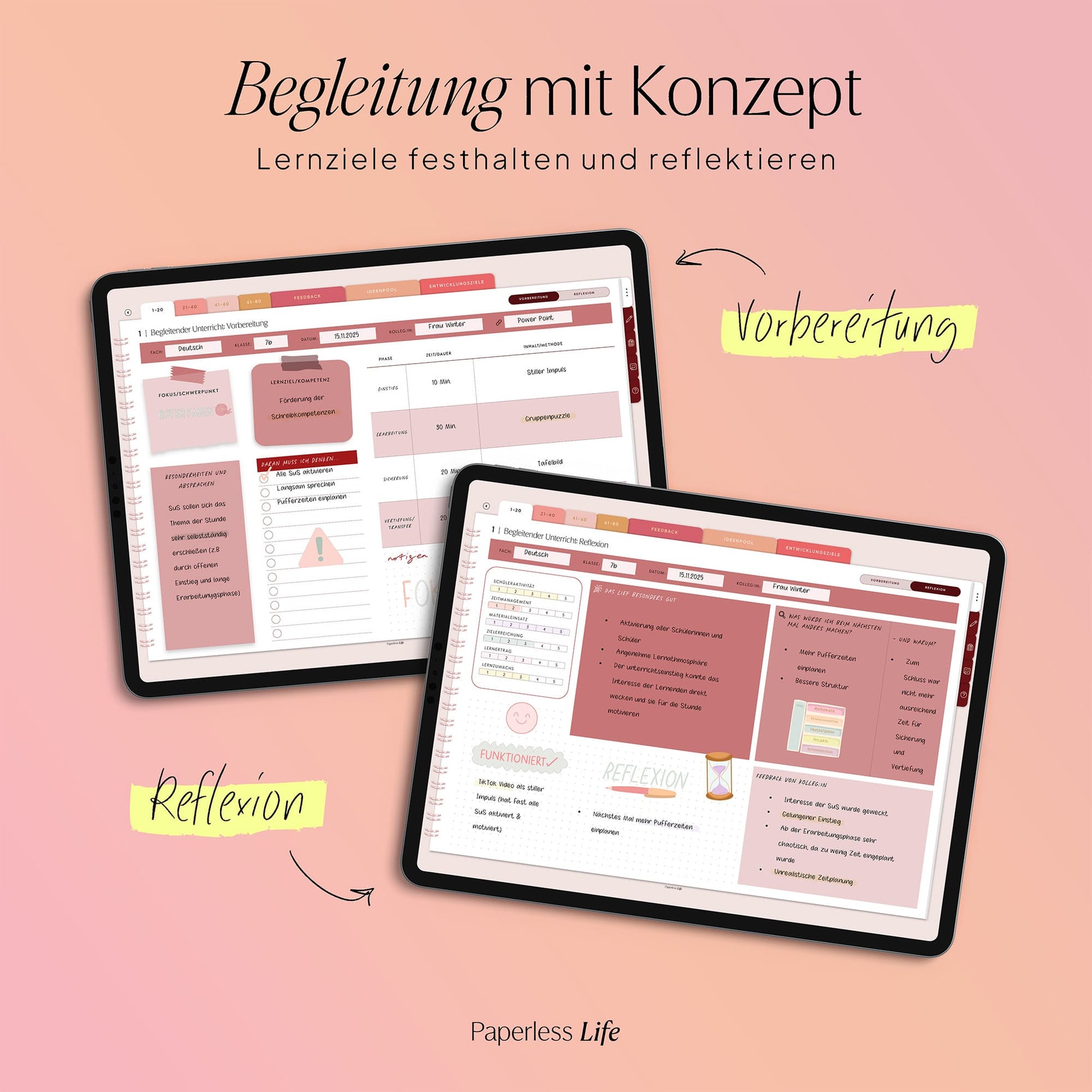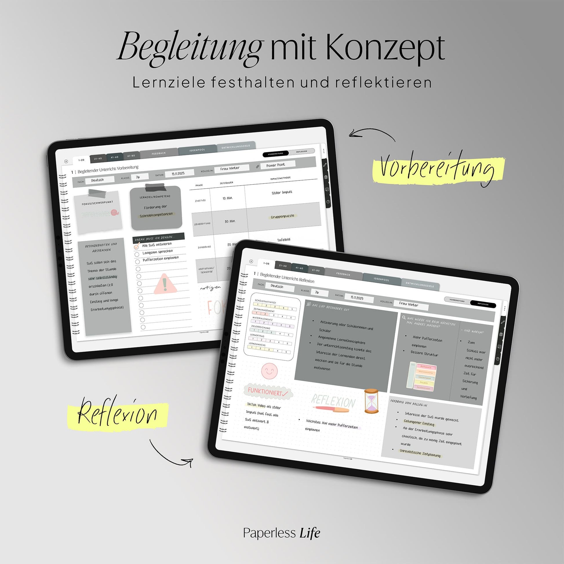 Das digitale Notizbuch für den begleitenden Unterricht bietet dir 80 Seiten, um deine Stunden übersichtlich zu dokumentieren. Jede Stunde erhält dabei zwei Doppelseiten: eine für die Vorbereitung und den Ablauf – und eine für deine persönliche Reflexion.