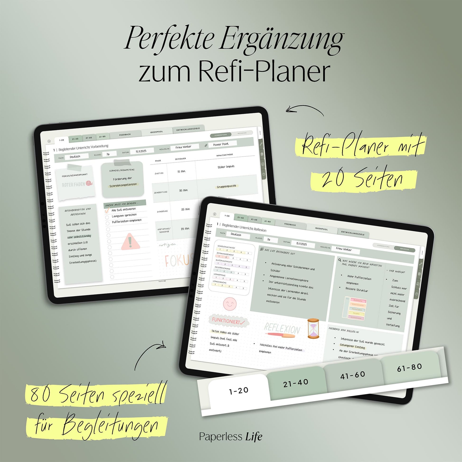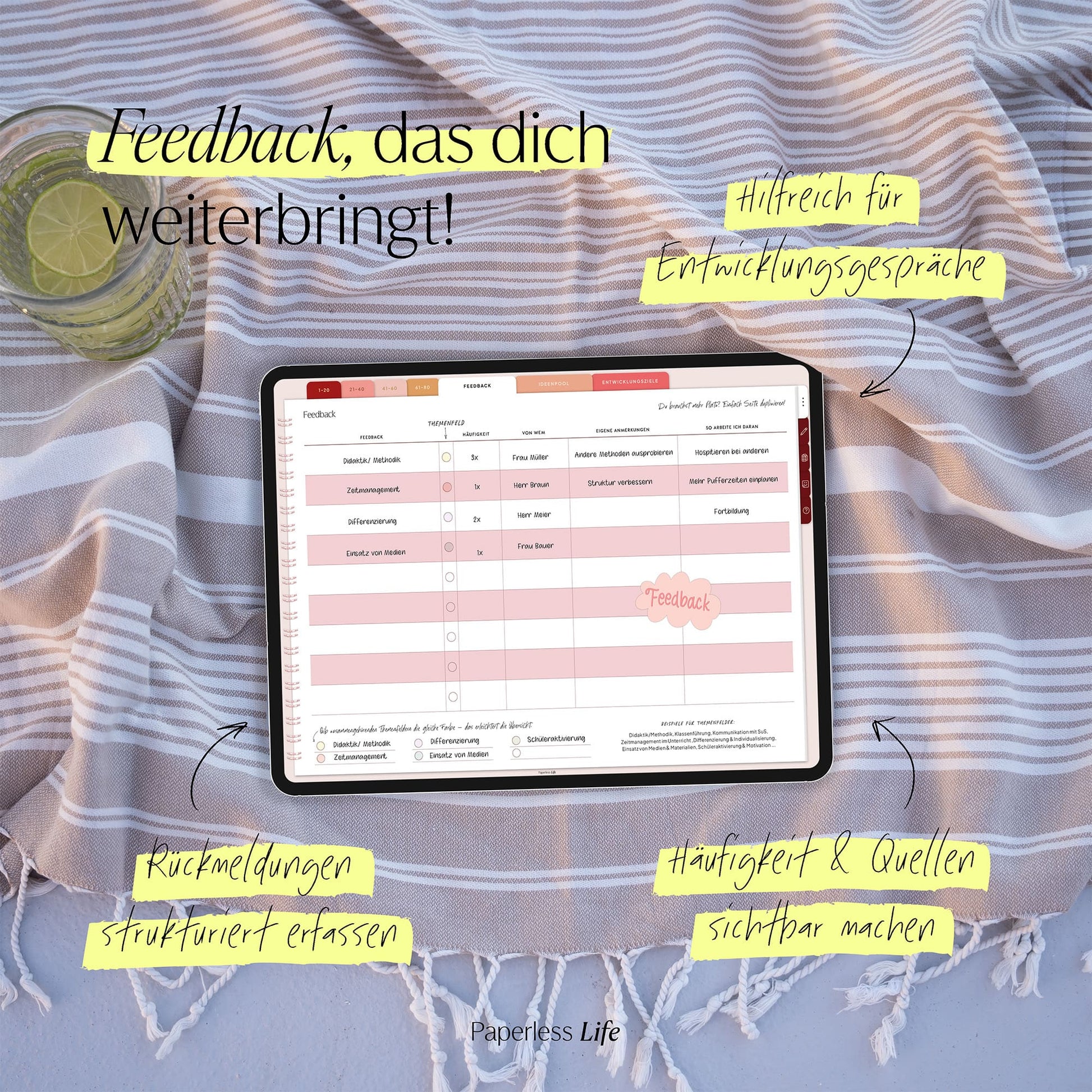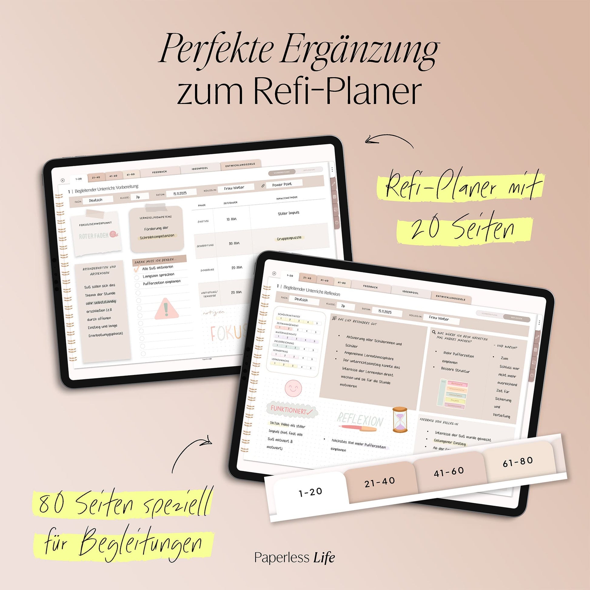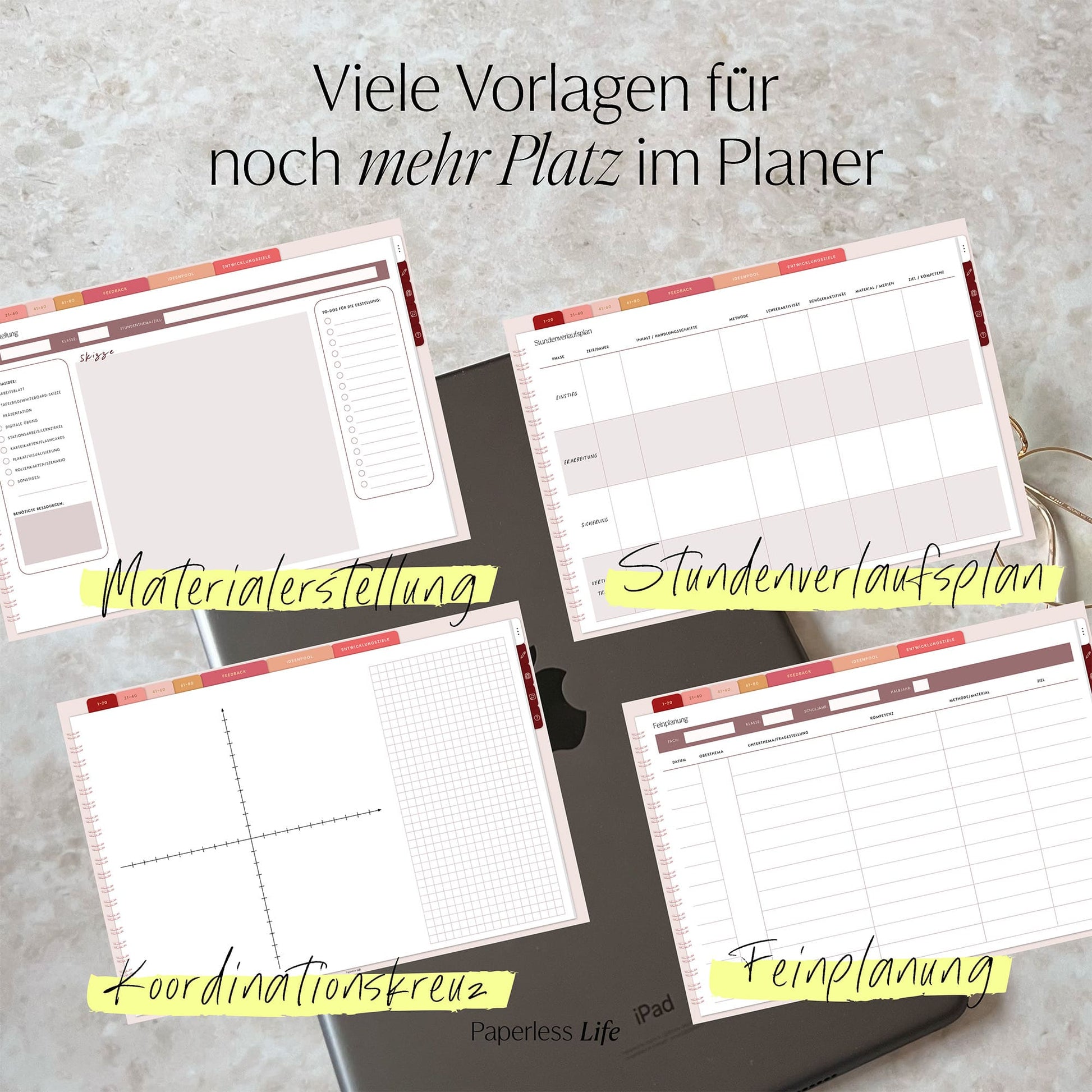 Das digitale Notizbuch für den begleitenden Unterricht bietet dir 80 Seiten, um deine Stunden übersichtlich zu dokumentieren. Jede Stunde erhält dabei zwei Doppelseiten: eine für die Vorbereitung und den Ablauf – und eine für deine persönliche Reflexion.