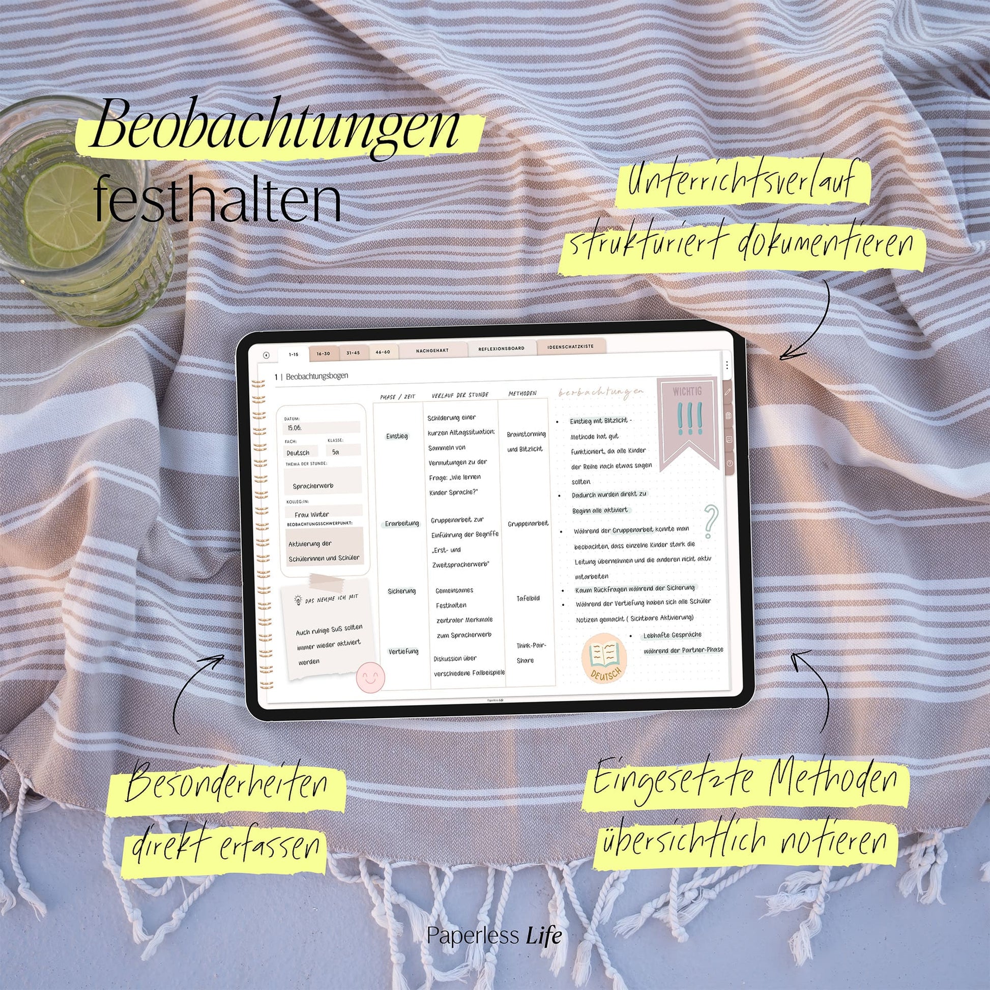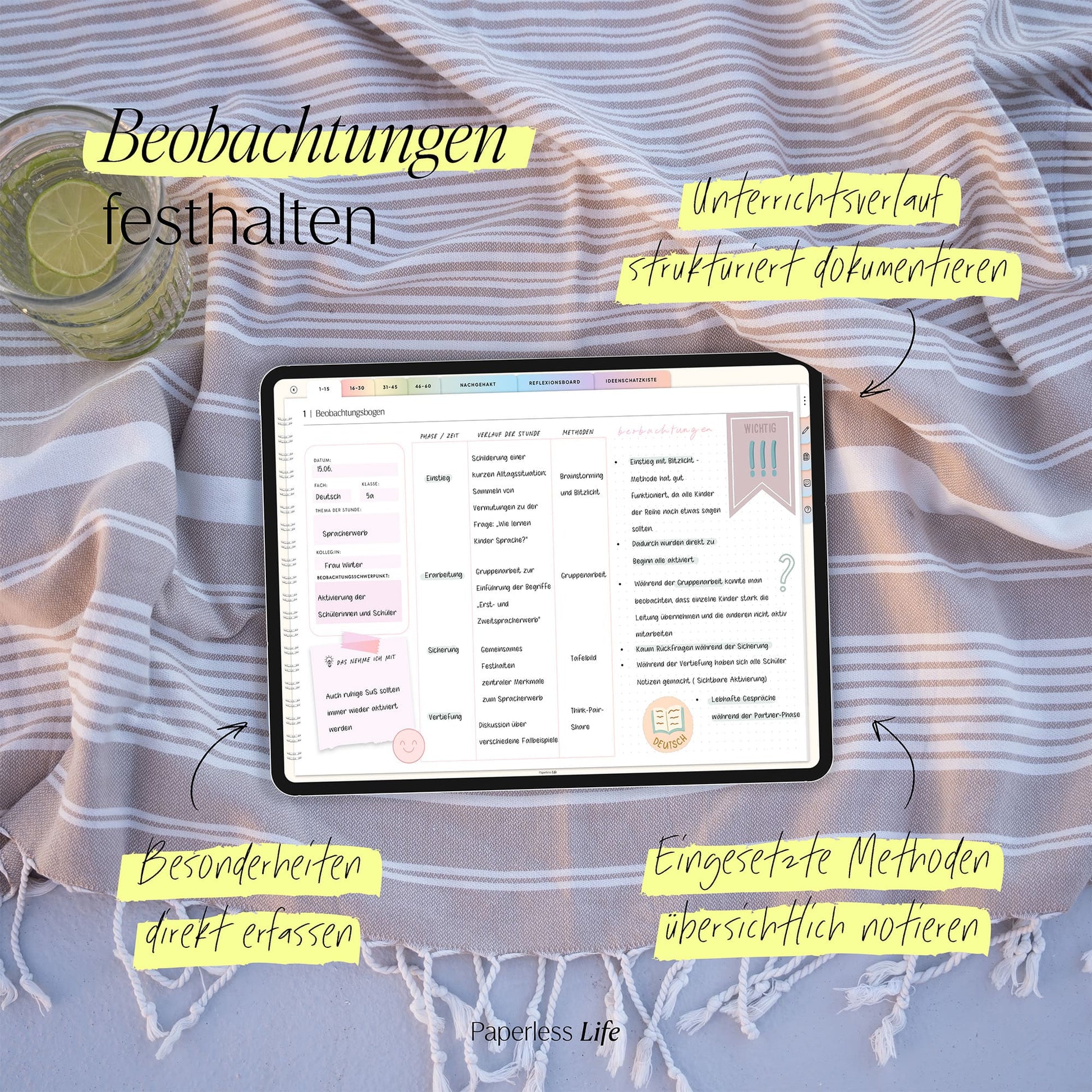 Auf 60 Beobachtungsbögen kannst du deine Verlaufsplanung, Methoden und Beobachtungen festhalten.
