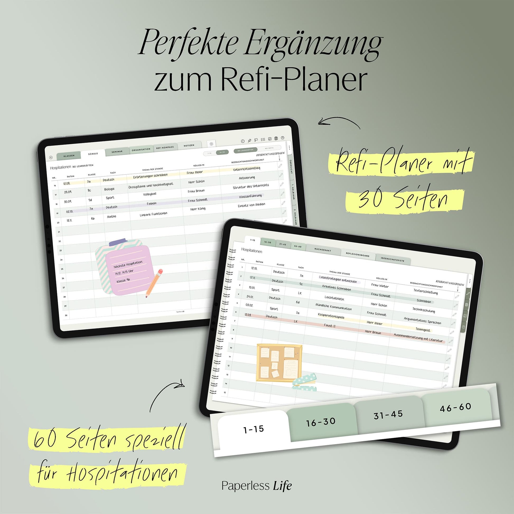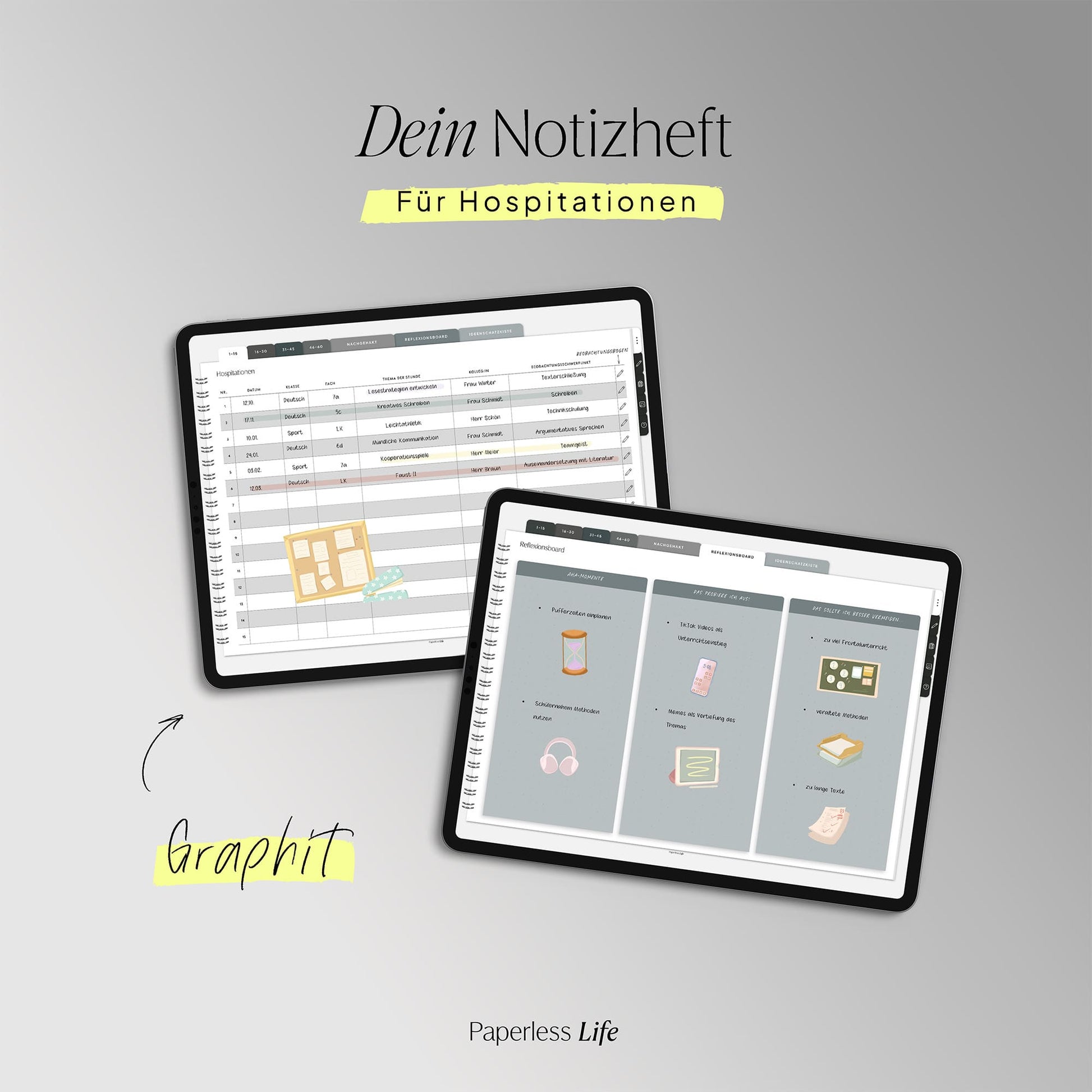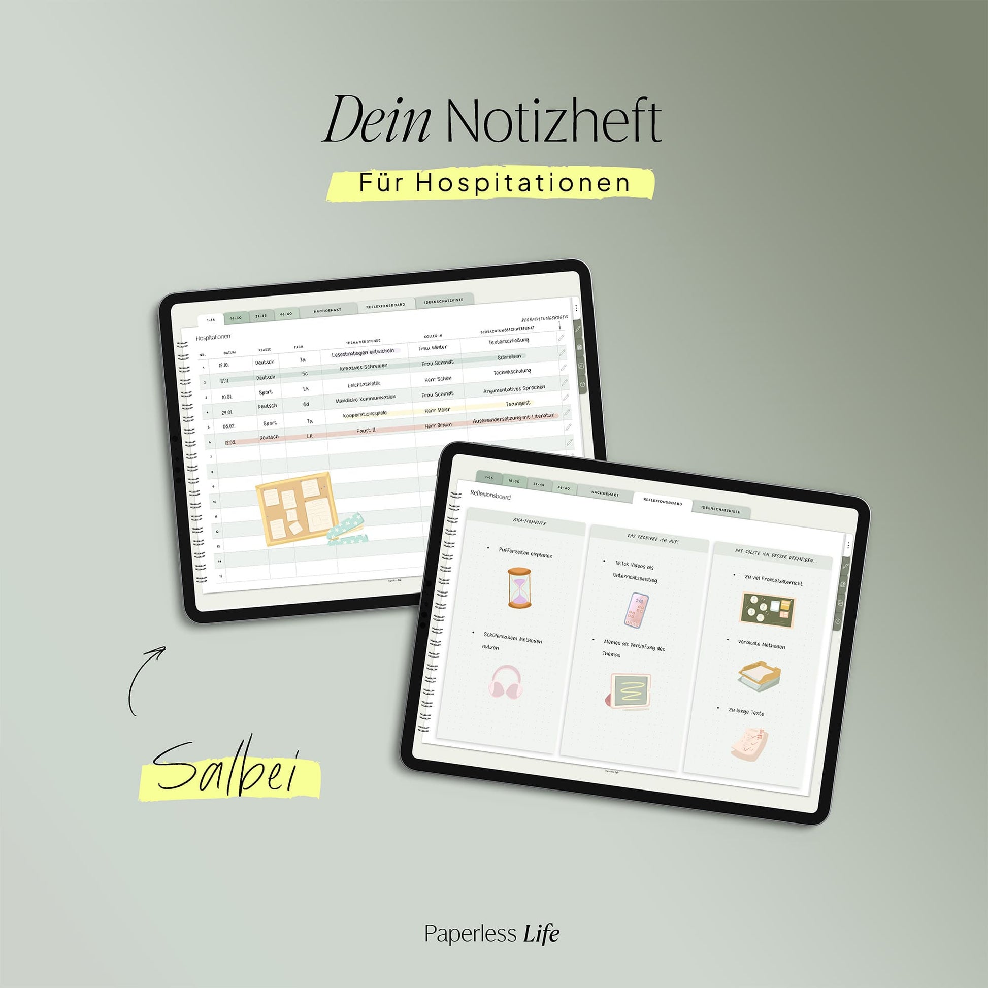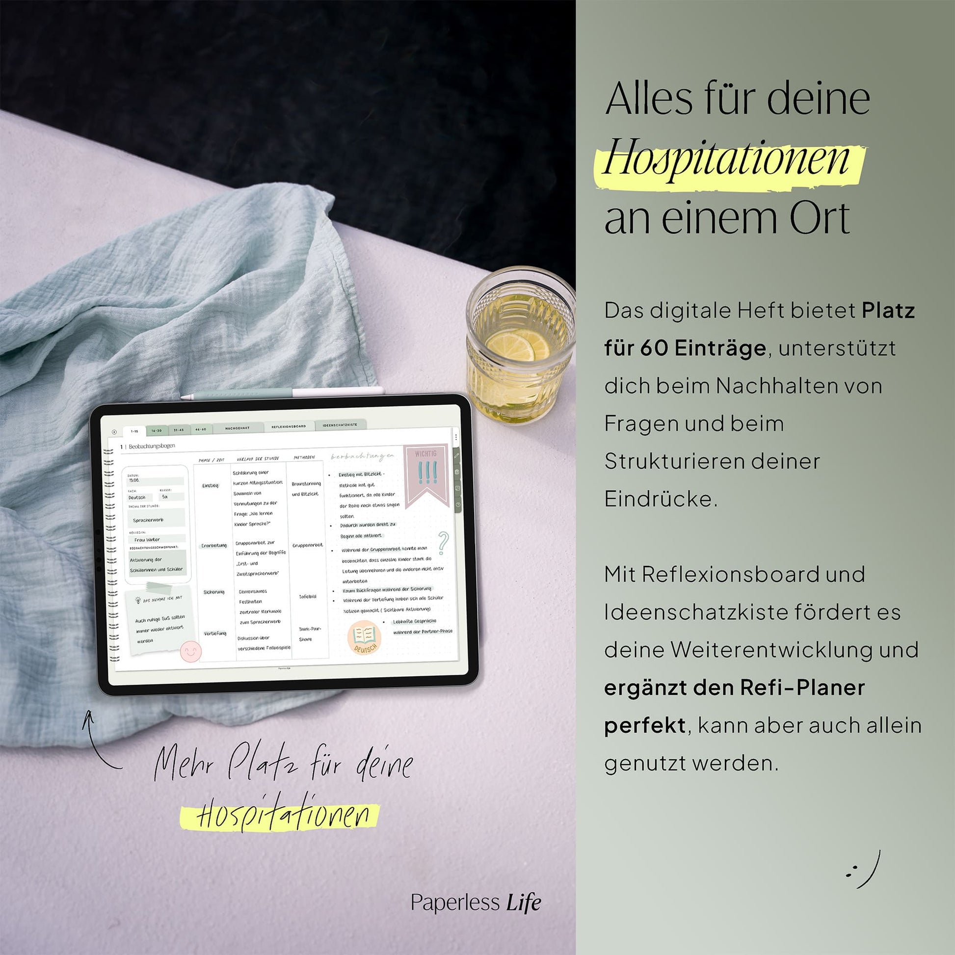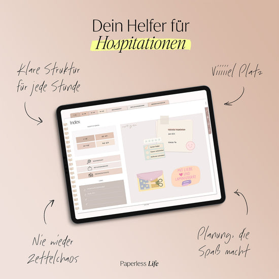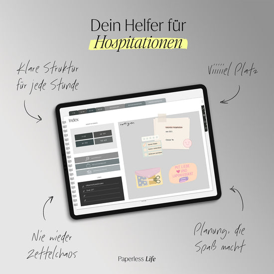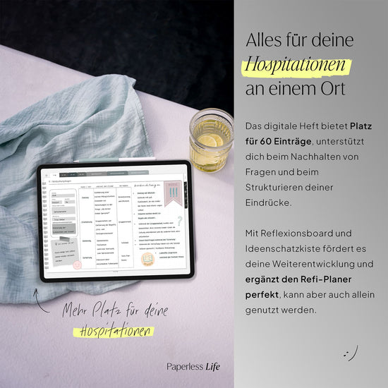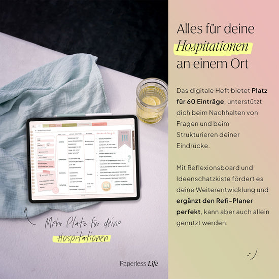 Das Hospitationsheft bietet Platz für 60 Einträge, unterstützt dich beim Nachhalten von Fragen und beim Strukturieren deiner Eindrücke.