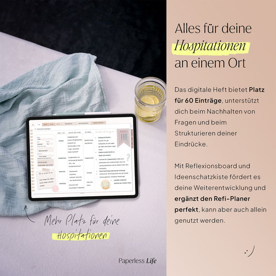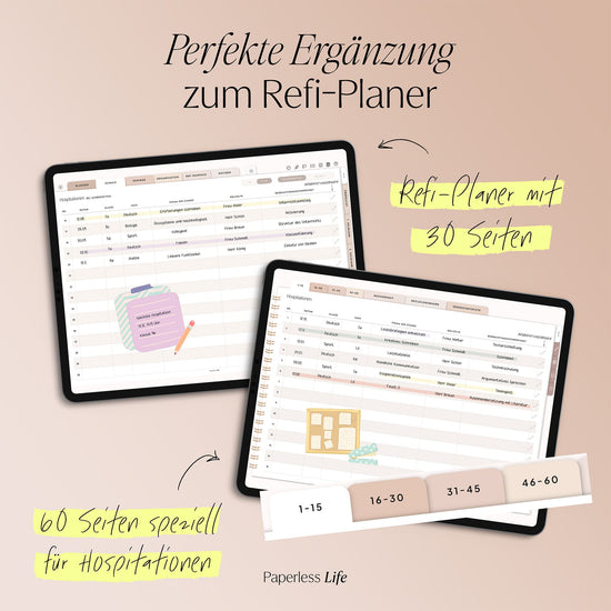 Im Refi-Planer findest du ebenfalls Seiten für den begleitenden Unterricht – allerdings nur 20 Doppelseiten. Hast du in deinem Bundesland mehr begleitenden Unterricht, eignet sich das separate Heft als perfekte Ergänzung zum Refi-Planer. Natürlich kannst du es auch unabhängig davon nutzen, falls du den Refi-Planer nicht benötigst.