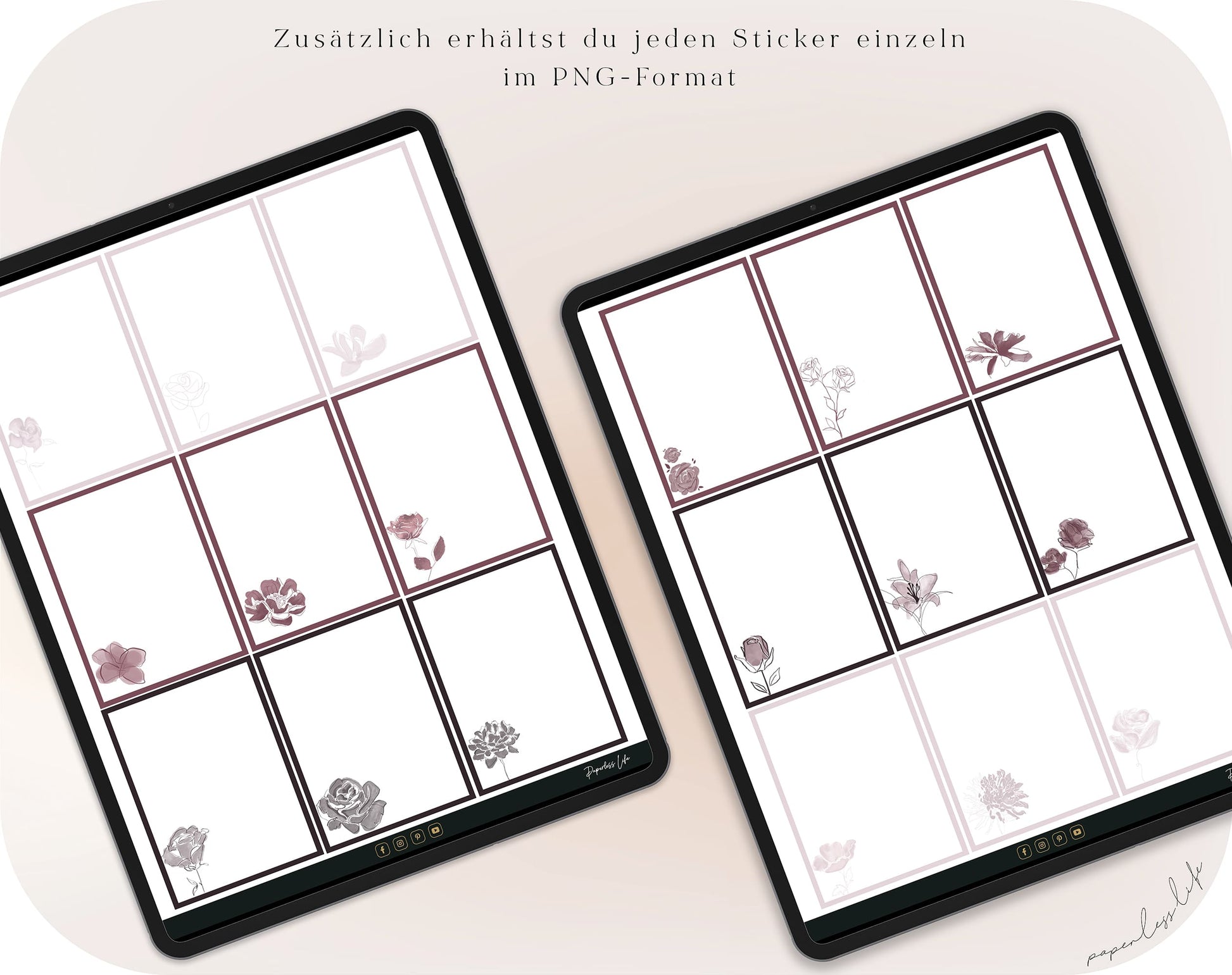 Falls du GoodNotes-Nutzer*in bist, kannst du die GoodNotes-Stickerdatei in GoodNotes öffnen und die vorgeschnittenen Sticker einfach mit dem Lasso kopieren und einfügen. Du kannst die Sticker jedoch auch mit anderen Notizen-Apps nutzen.