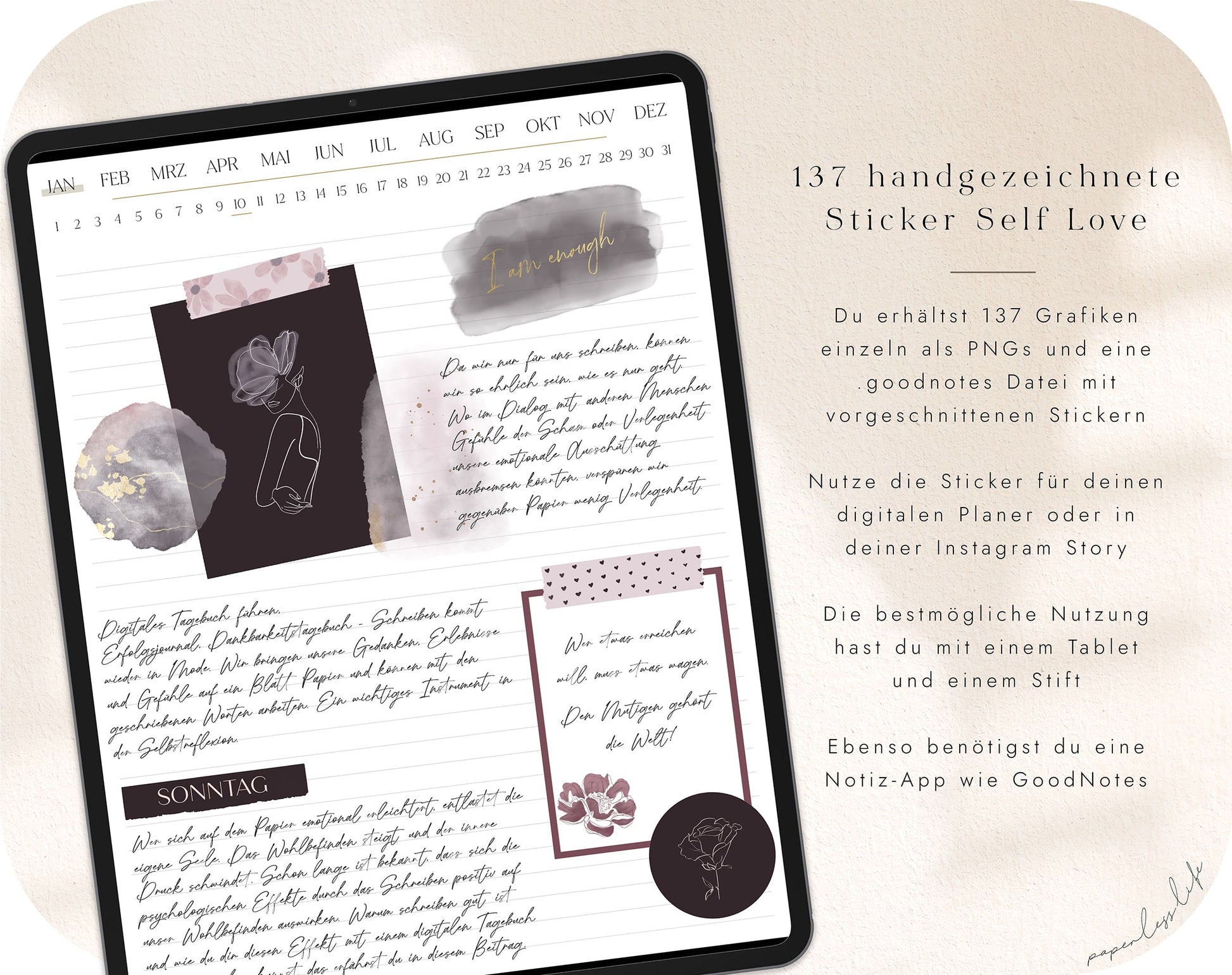 Digitale Sticker Self Love für GoodNotes und andere Notizen-Apps. Insgesamt erhältst du 137 digitale Sticker als .goodnotes Datei, die du für deinen digitalen Planer verwenden kannst. Die Sticker in der .goodnotes-Datei sind alle zugeschnitten, damit du sie ganz einfach kopieren und einfügen kannst.