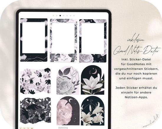 Falls du GoodNotes-Nutzer*in bist, kannst du das verlinkte Stickerbuch in GoodNotes öffnen und die vorgeschnittenen Sticker einfach mit dem Lasso kopieren und einfügen. Du kannst die Sticker jedoch auch mit anderen Notizen-Apps nutzen.