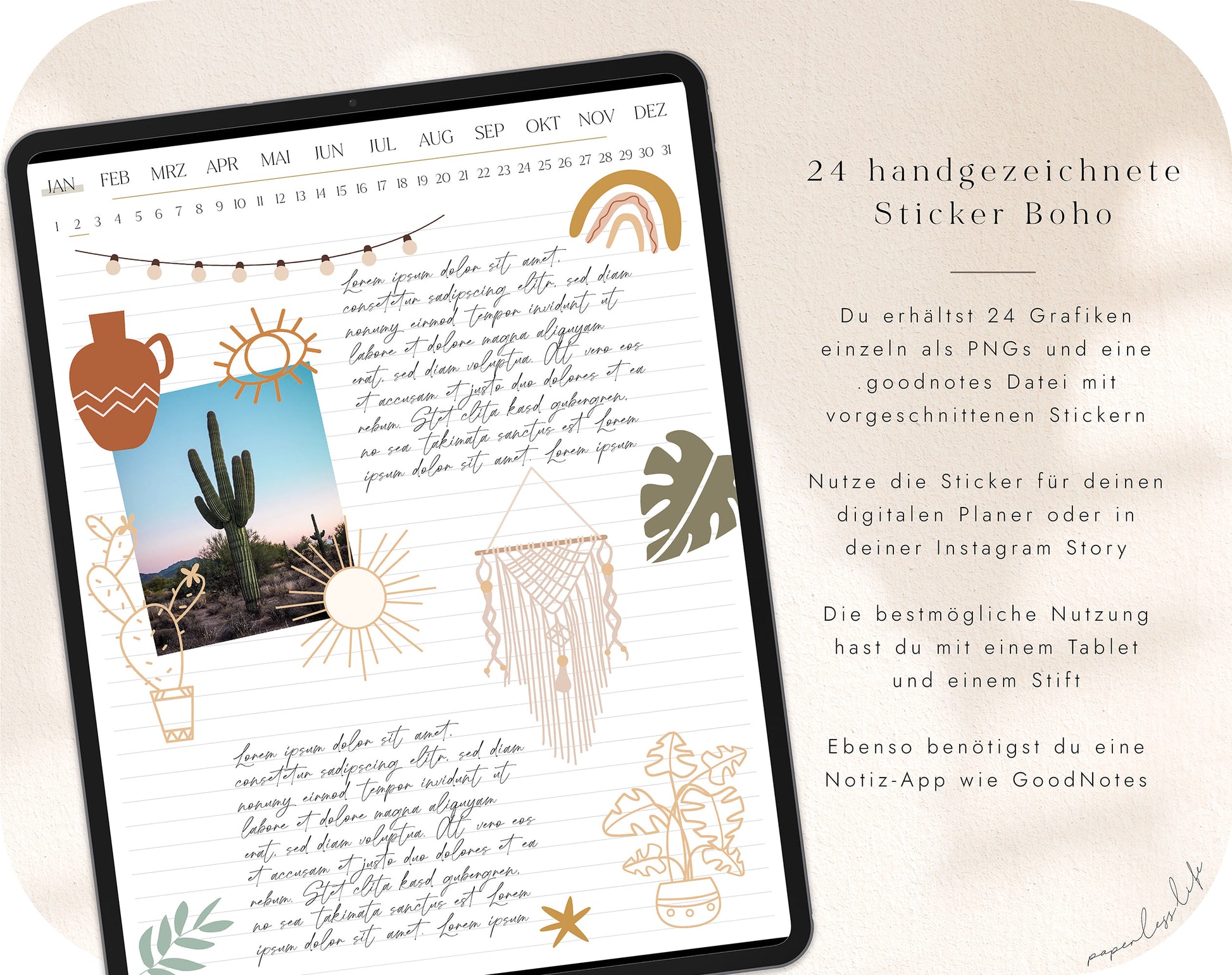 24 digitale Boho Sticker für digitale Planer. Mache es dir in deinem digitalen Planer gemütlich und dekoriere deine Seiten mit unseren BOHO Planner Stickers. Zusätzlich erhältst du eine Sticker-Datei für GoodNotes mit vorgeschnittenen Stickern, die nur auf dein Lasso warten!