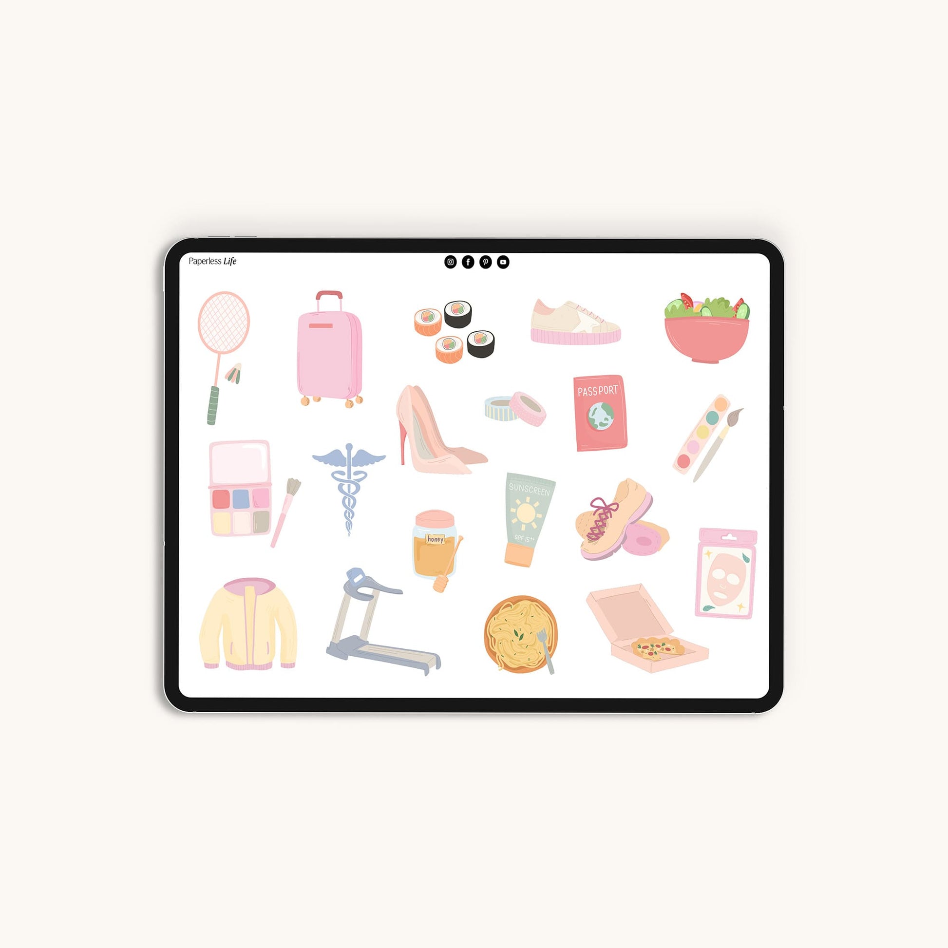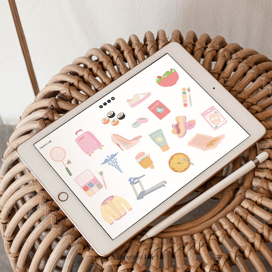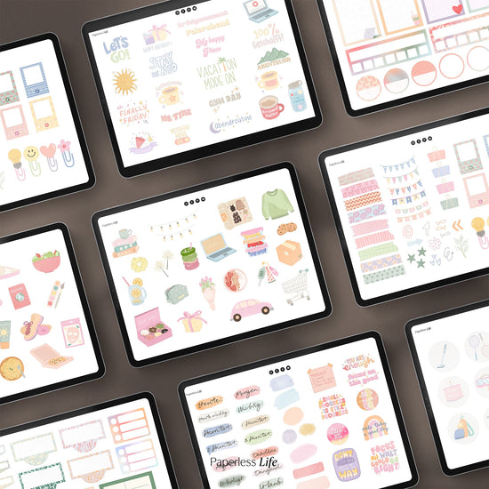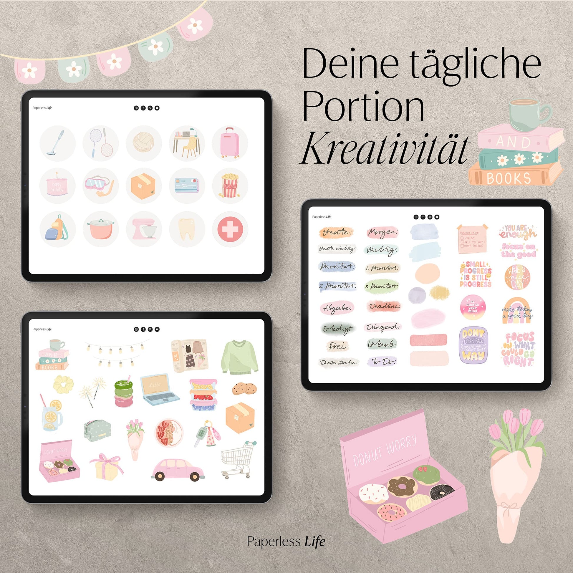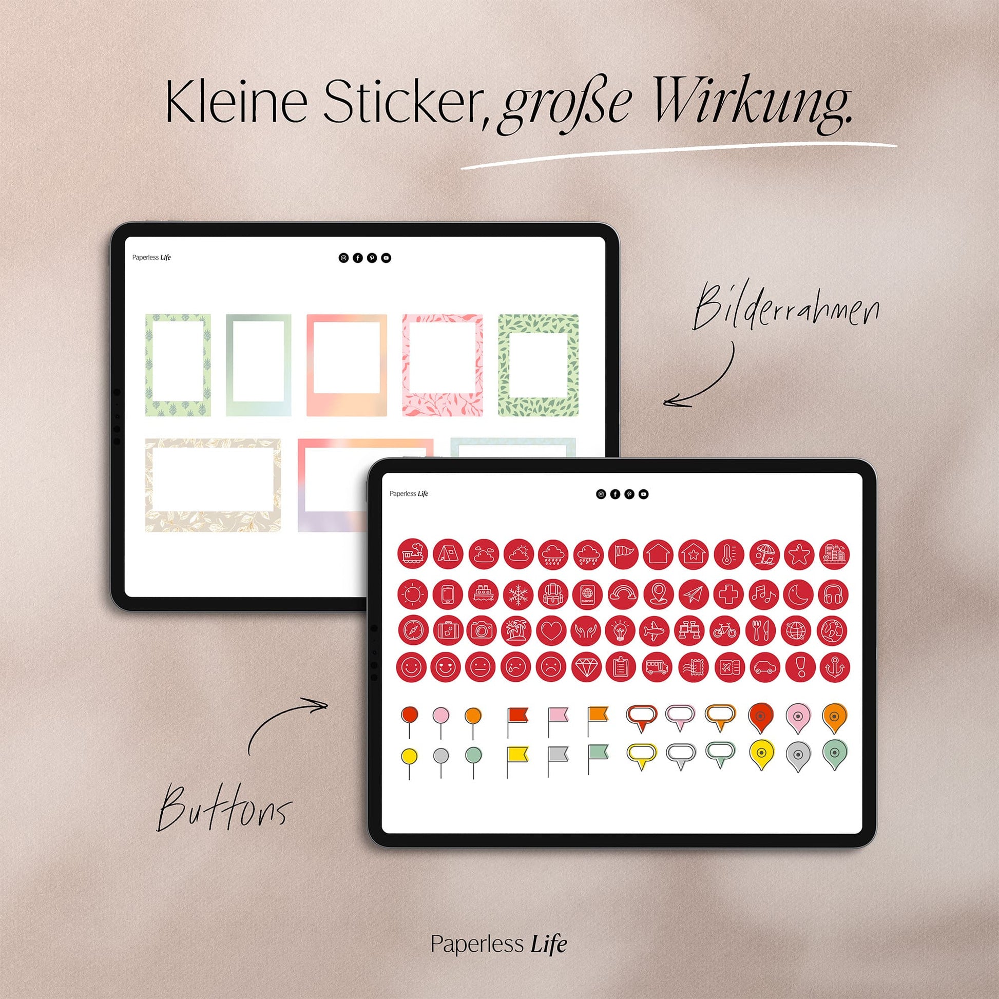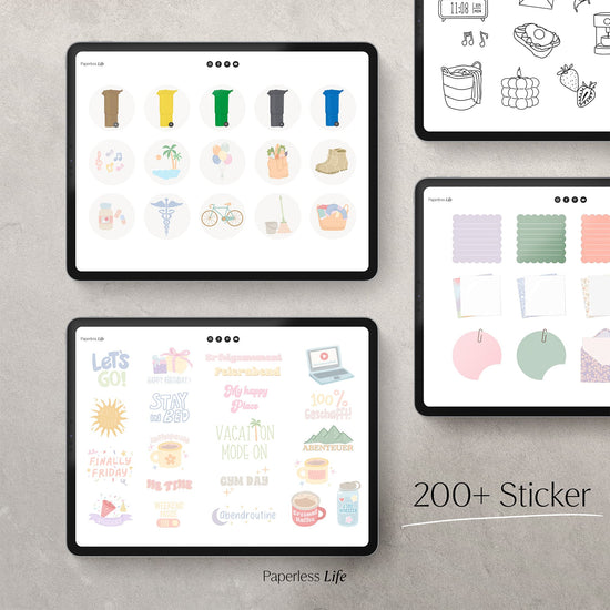 Falls du GoodNotes nutzt, kannst du das verlinkte Stickerbuch in GoodNotes öffnen und die Sticker einfach mit dem Lasso kopieren und in deinem digitalen Planer einfügen. Du kannst die Sticker aber auch mit anderen Notizen-Apps nutzen, wie Samsung Notes, Notability, Xodo usw.