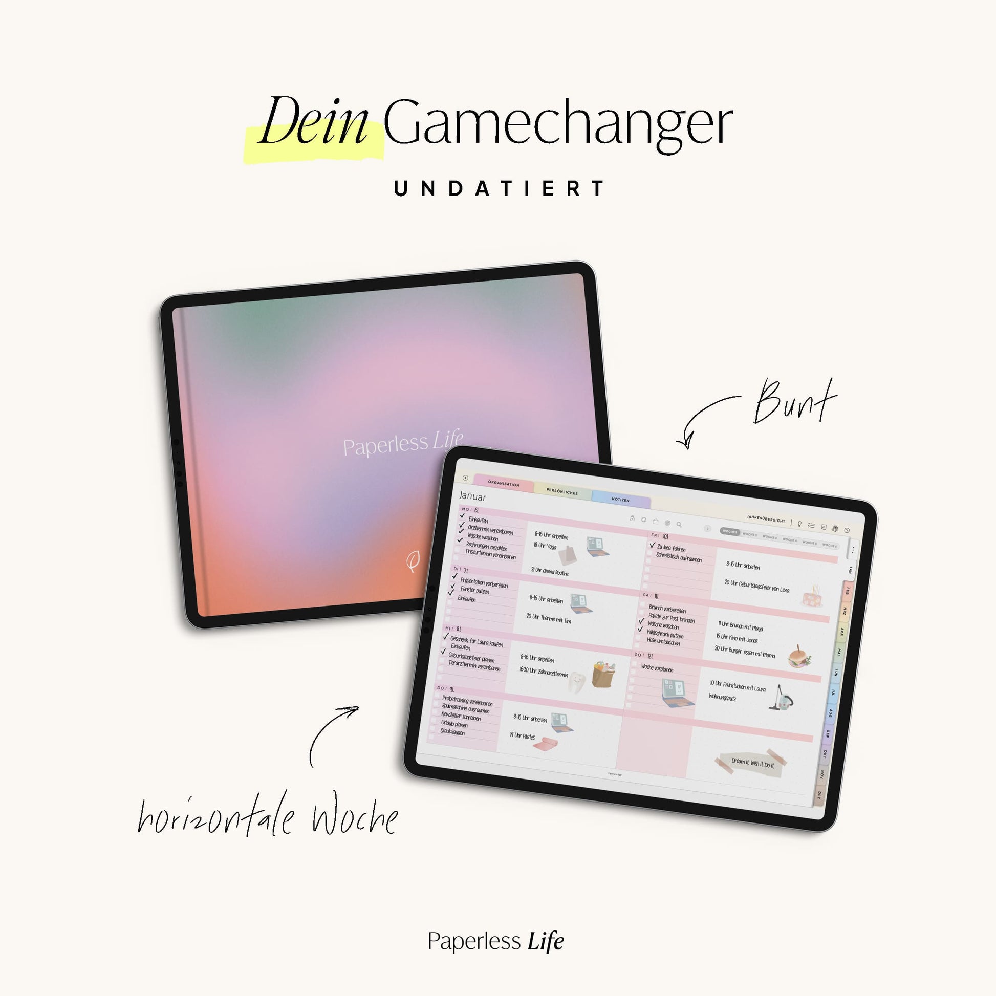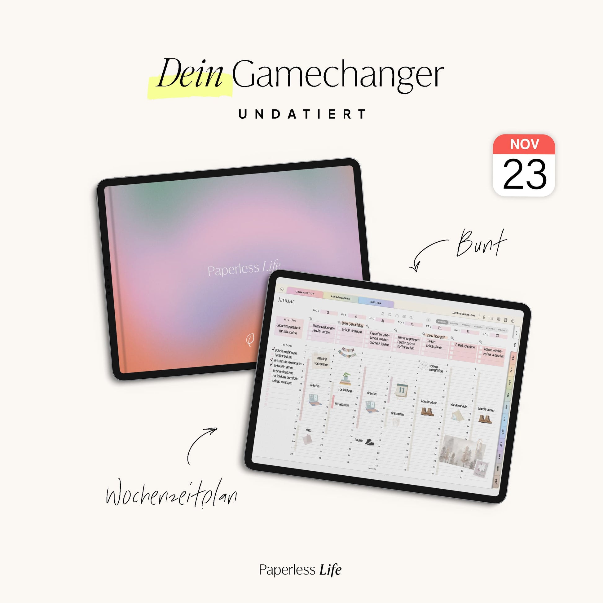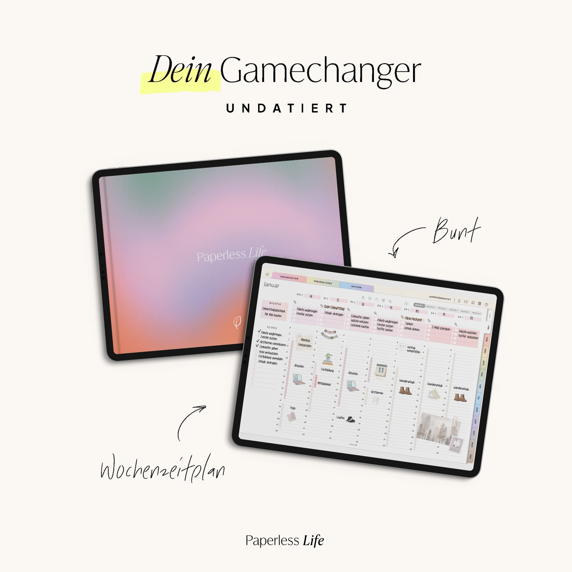 Hinweis zur Datierung: Der undatierte Gamechanger enthält keine vorgegebenen Daten. Du trägst sie ganz einfach selbst ein – entweder handschriftlich oder mit Textfeldern. So kannst du jederzeit starten und den Planer jedes Jahr wiederverwenden.