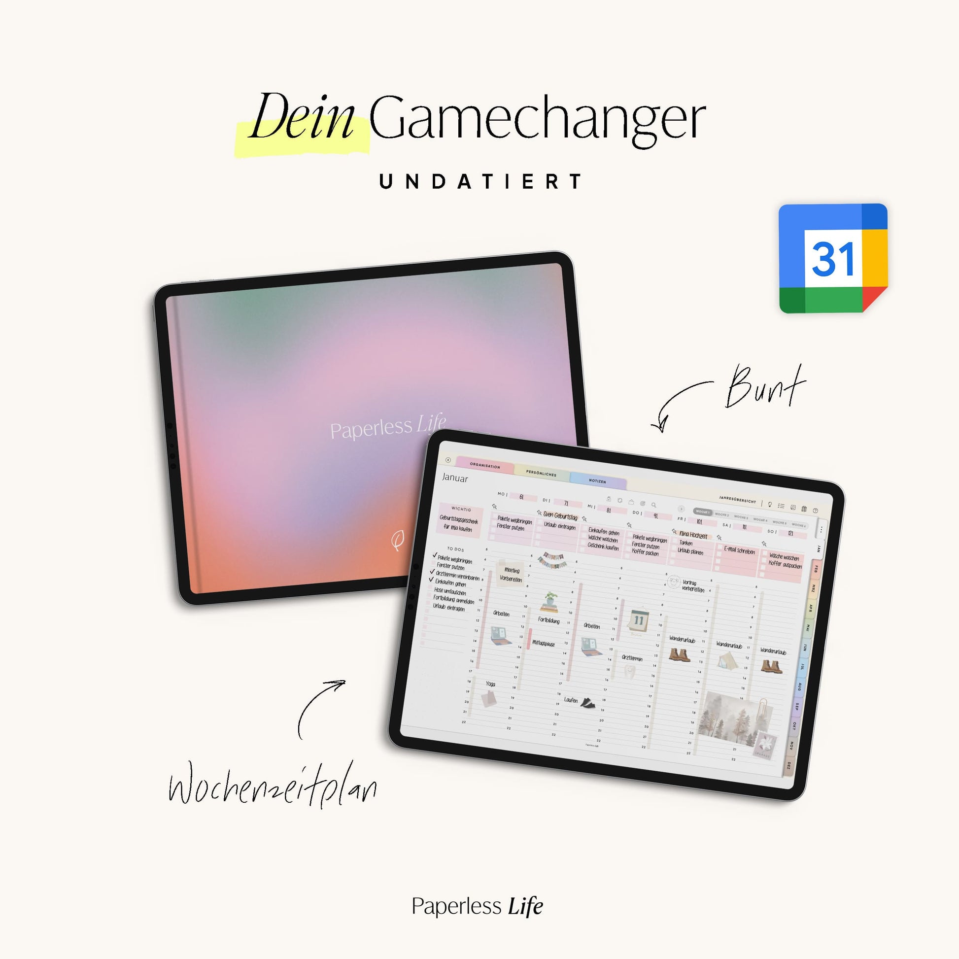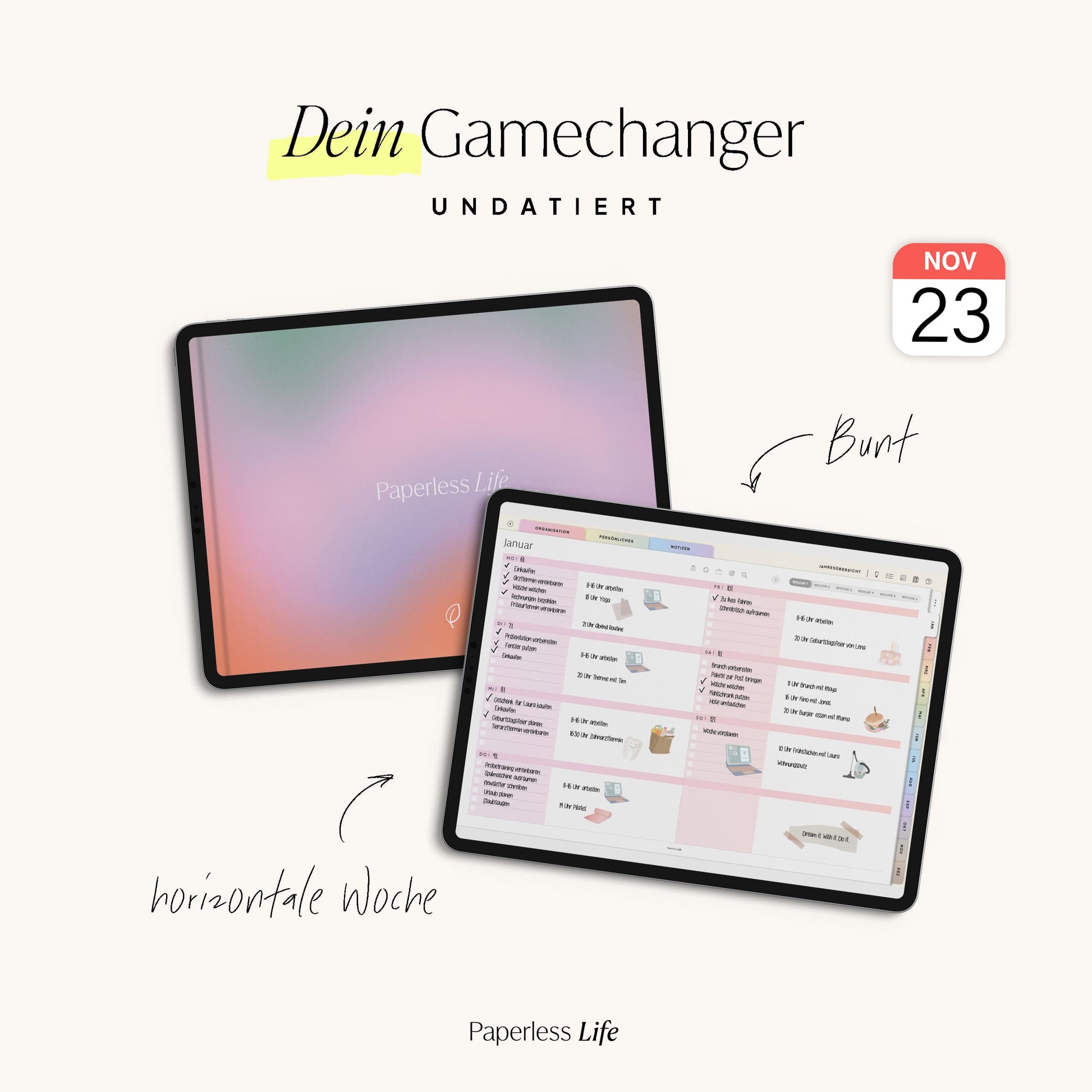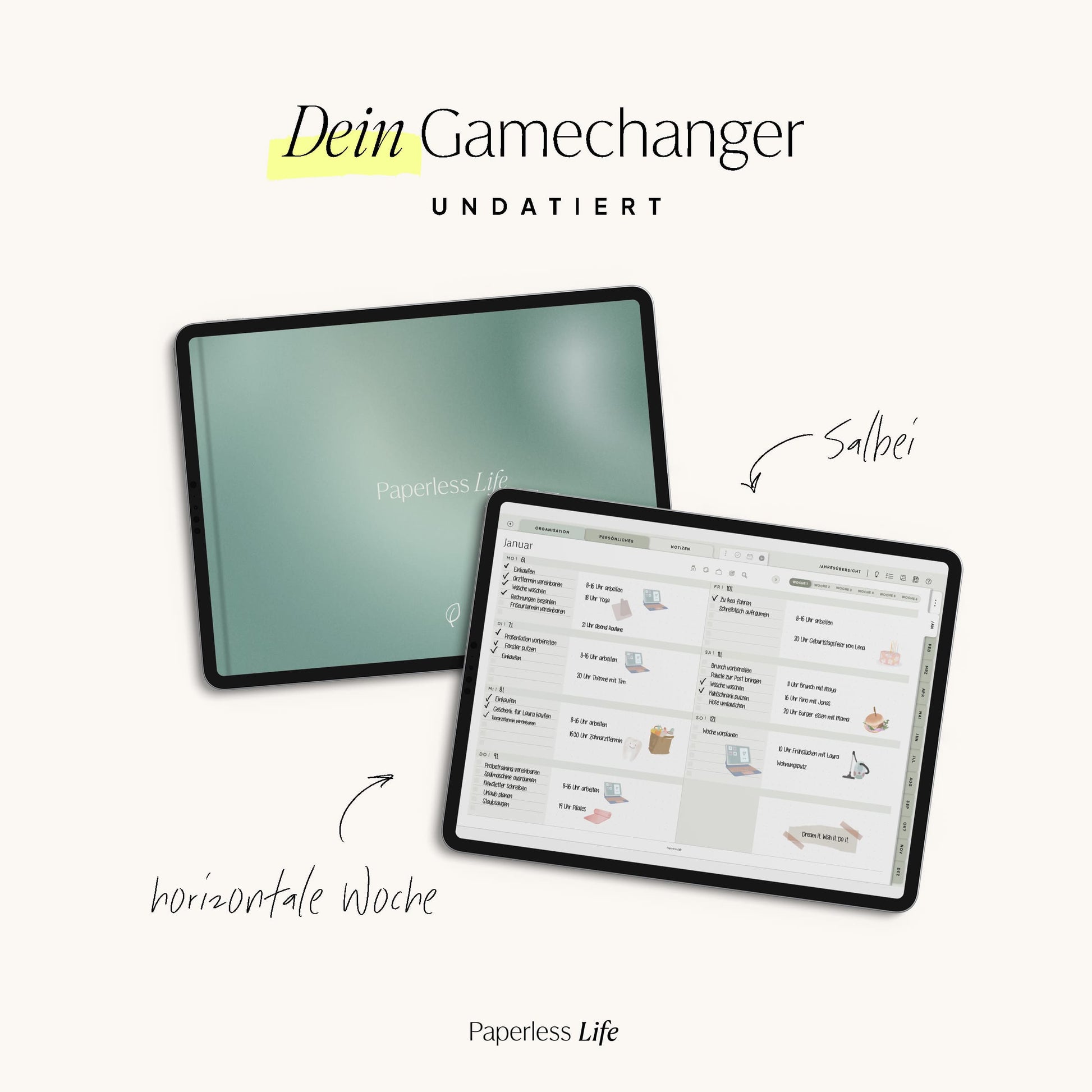 Hinweis zur Datierung: Der undatierte Gamechanger enthält keine vorgegebenen Daten. Du trägst sie ganz einfach selbst ein – entweder handschriftlich oder mit Textfeldern. So kannst du jederzeit starten und den Planer jedes Jahr wiederverwenden.