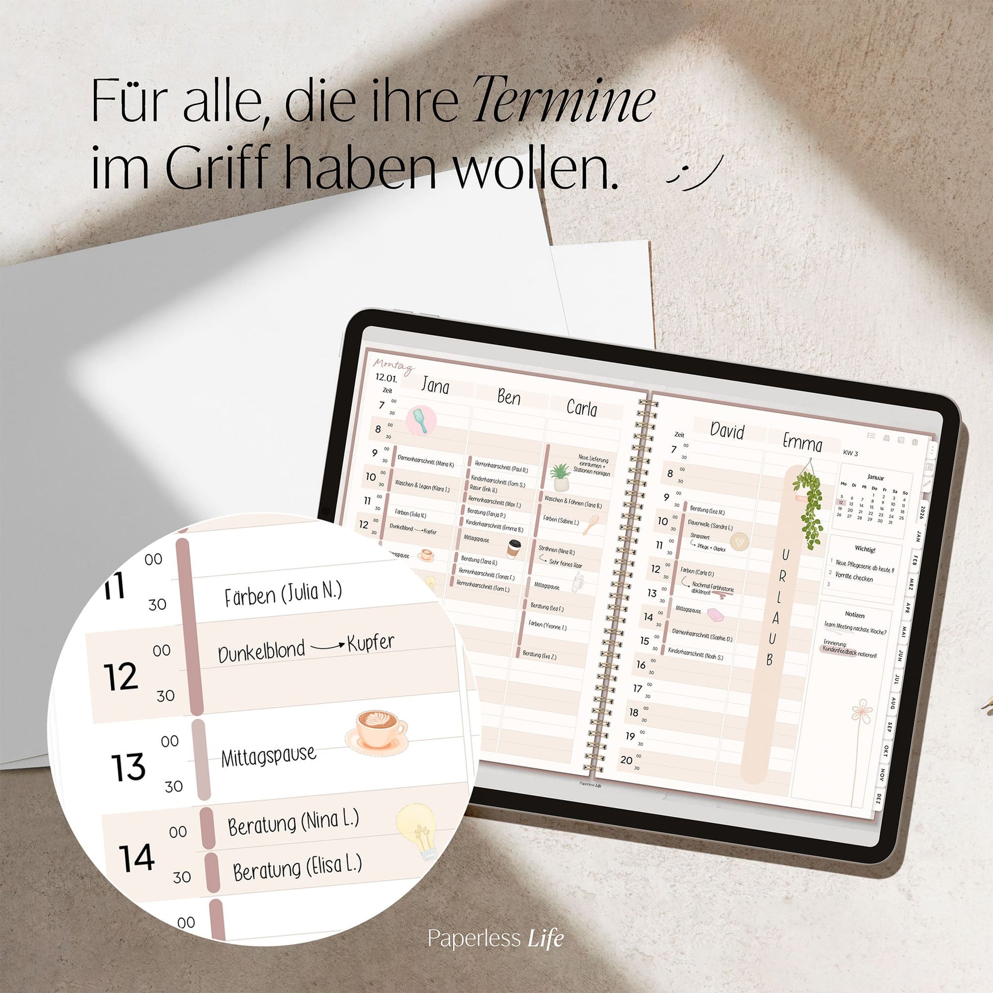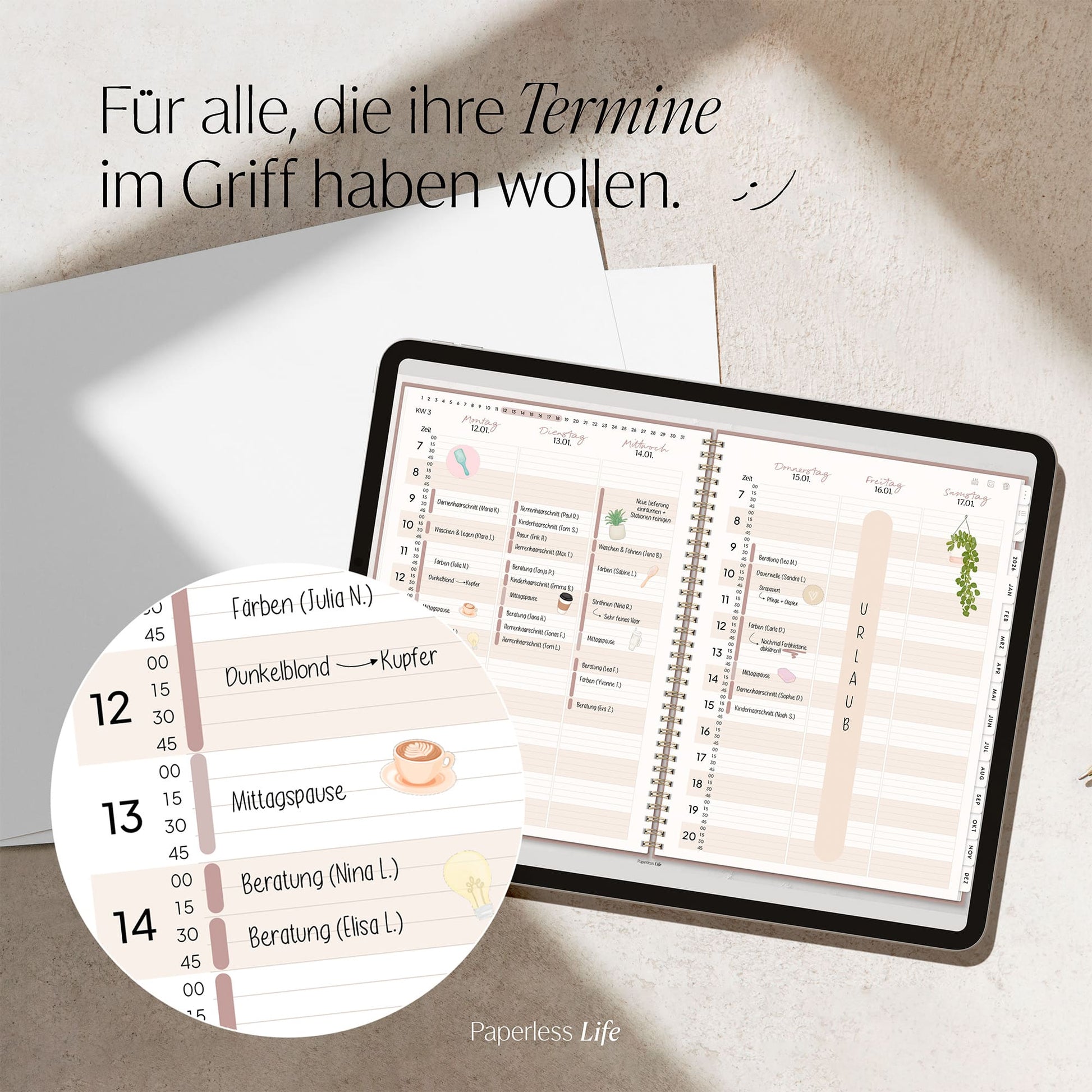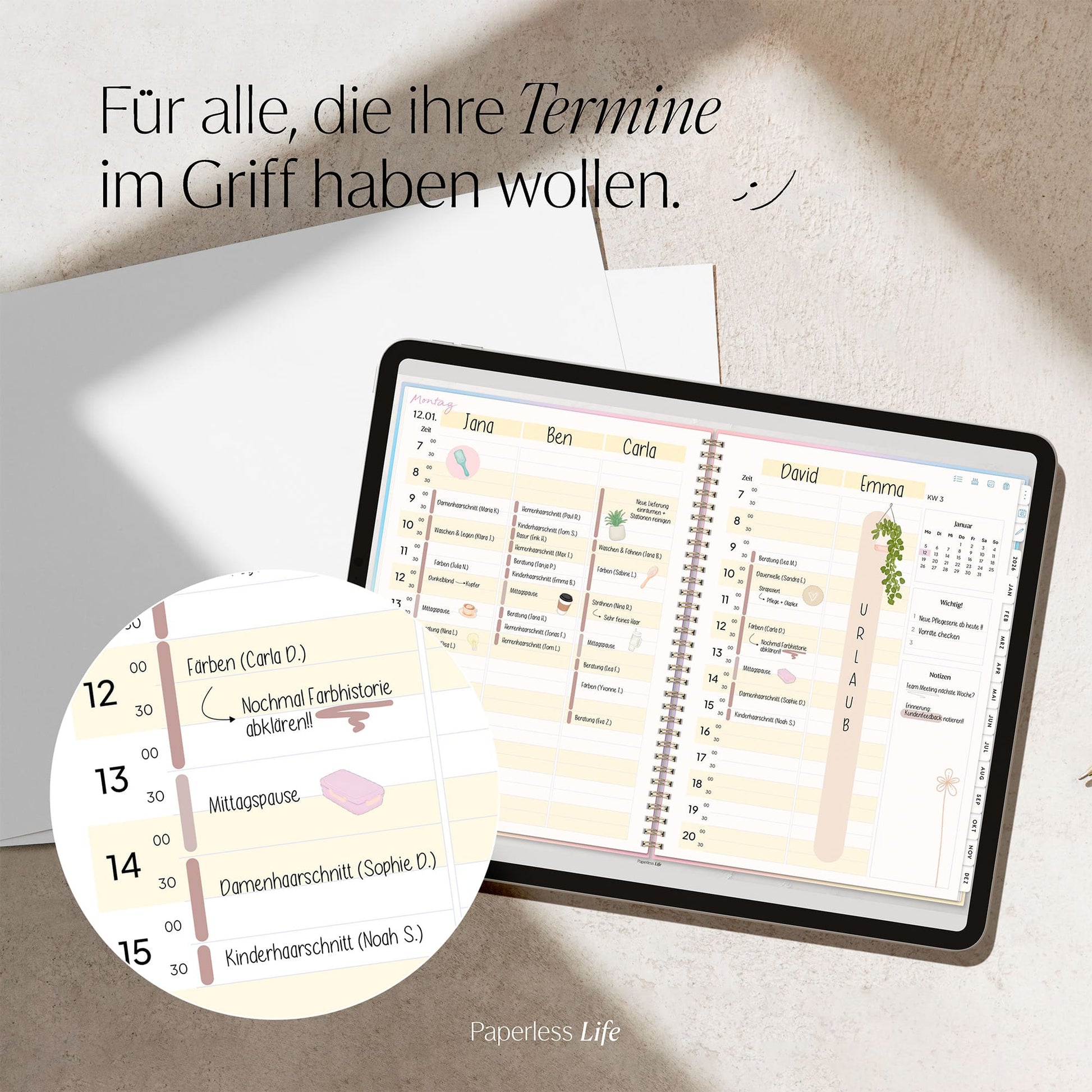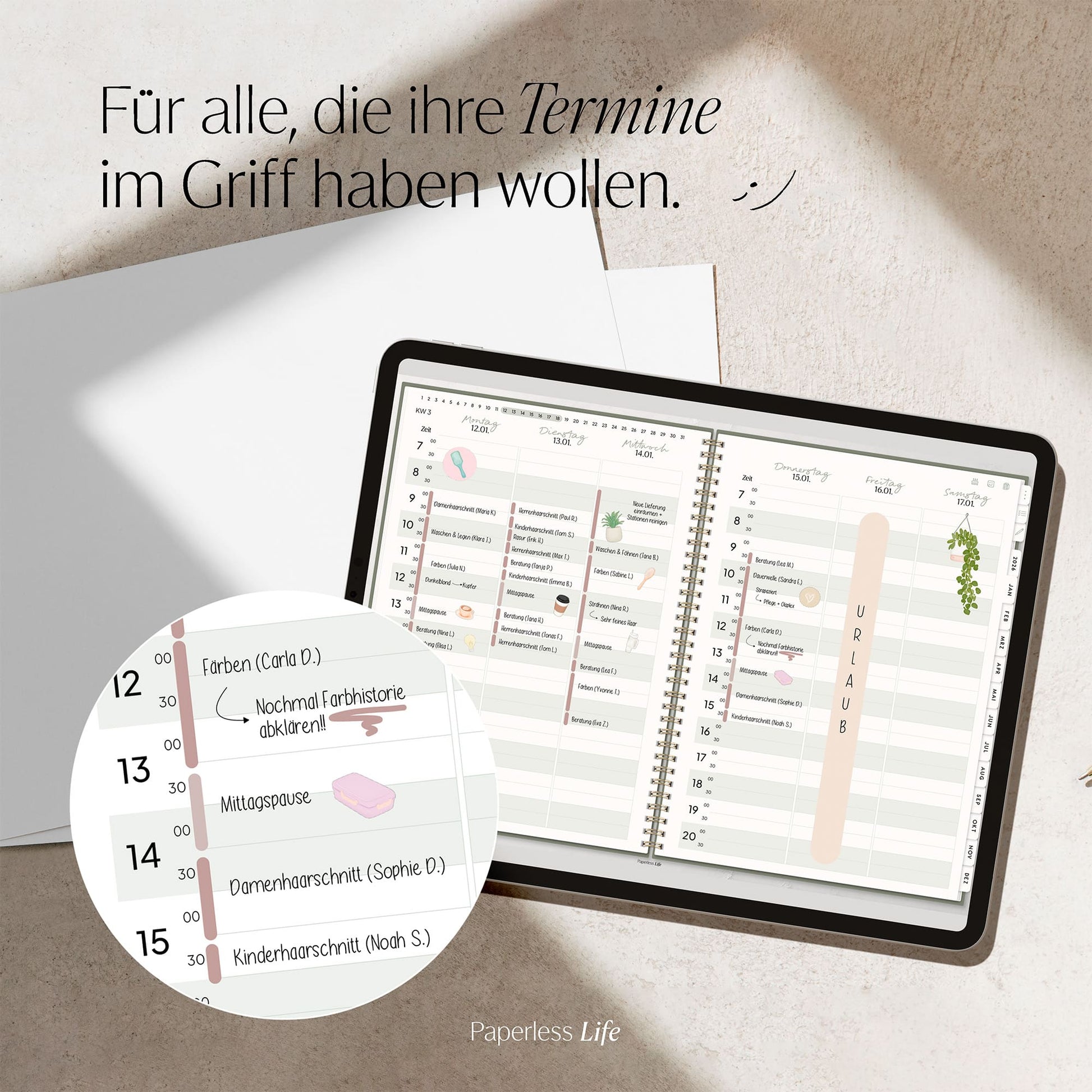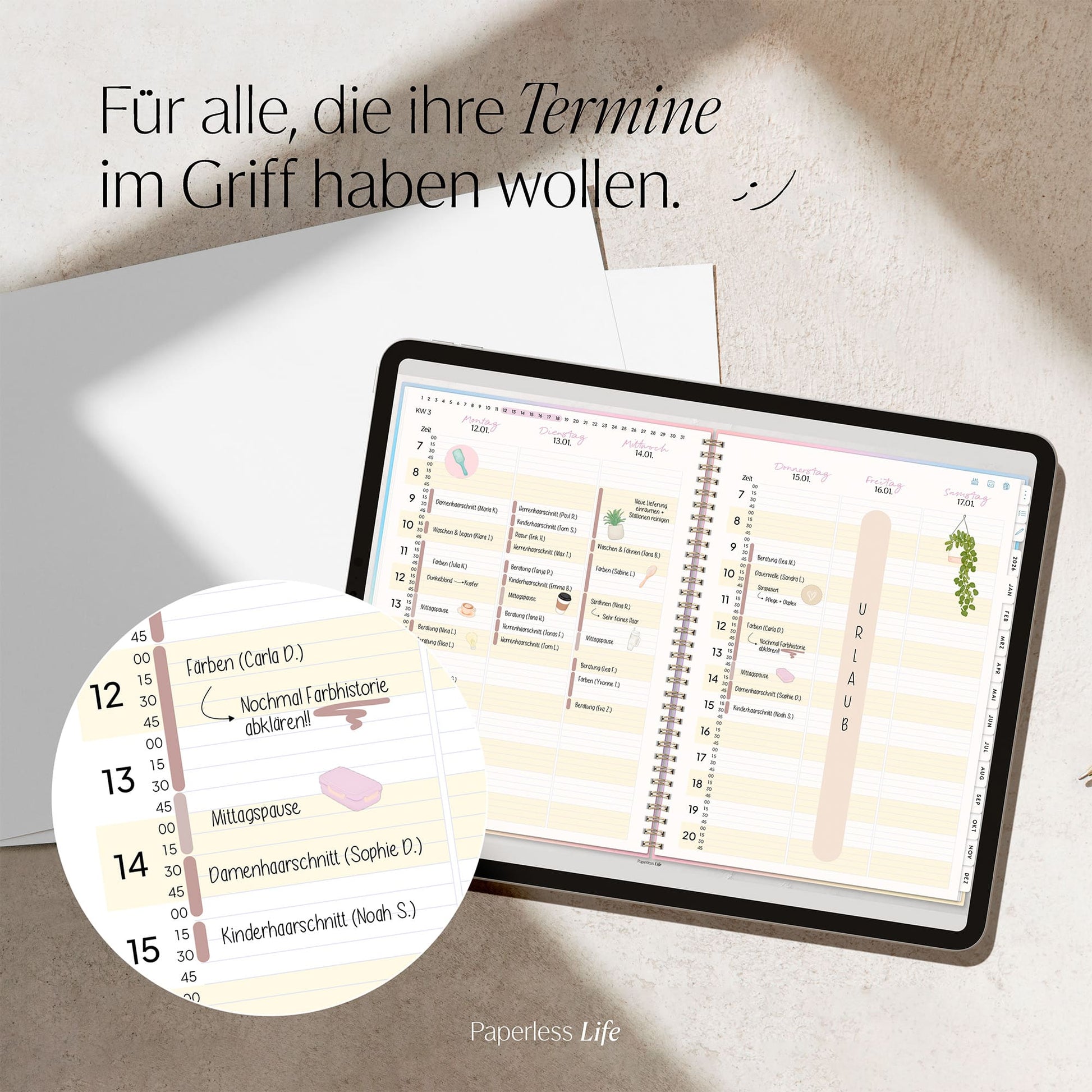 Der digitale Terminplaner 2026 ist dein professionelles Planungstool fürs Tablet. Alle Termine übersichtlich an einem Ort – klar strukturiert, flexibel nutzbar und ideal für Solo-Selbstständige oder kleine Teams bis zu fünf Mitarbeitenden. Kompatibel mit Goodnotes & Co. – für effizientes Arbeiten ohne Papierkram.