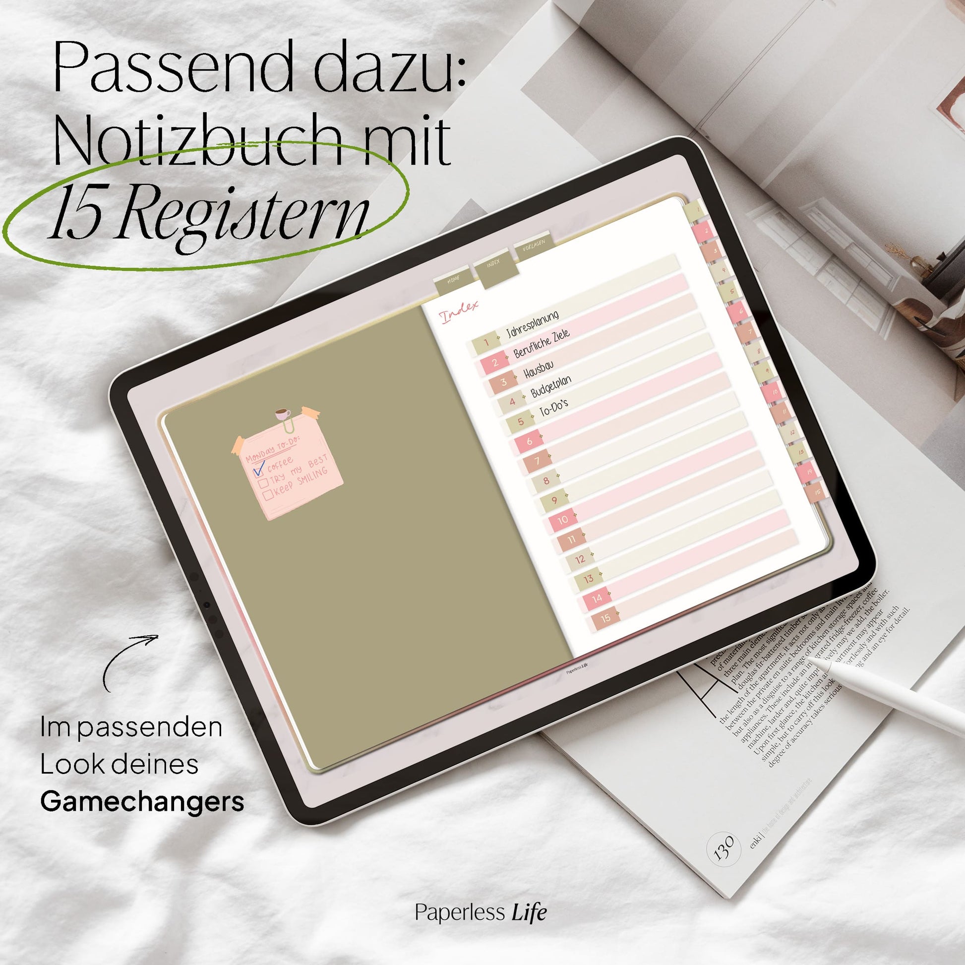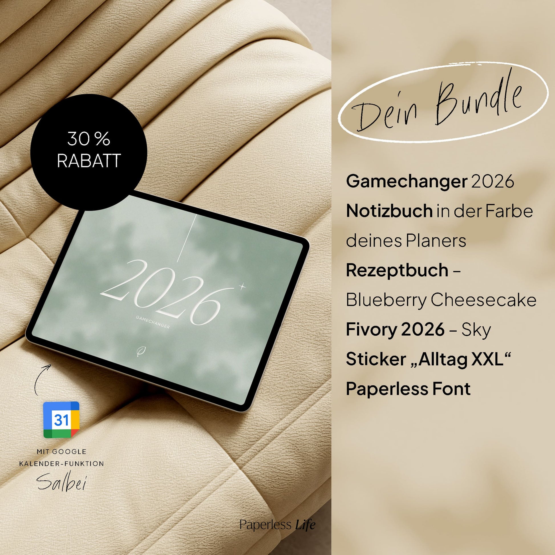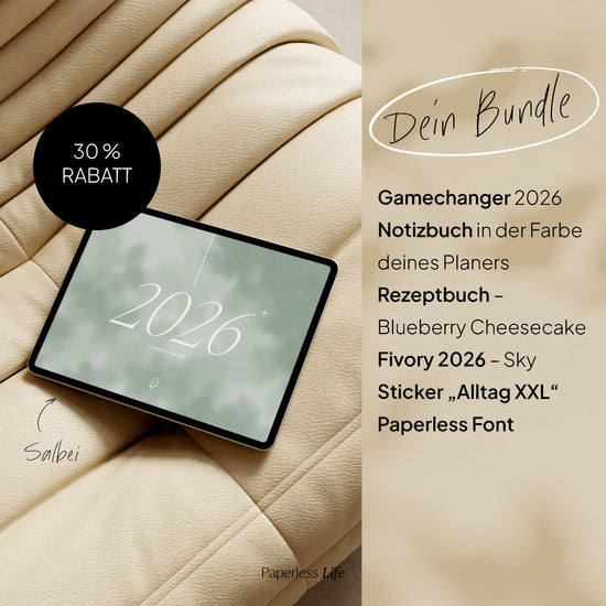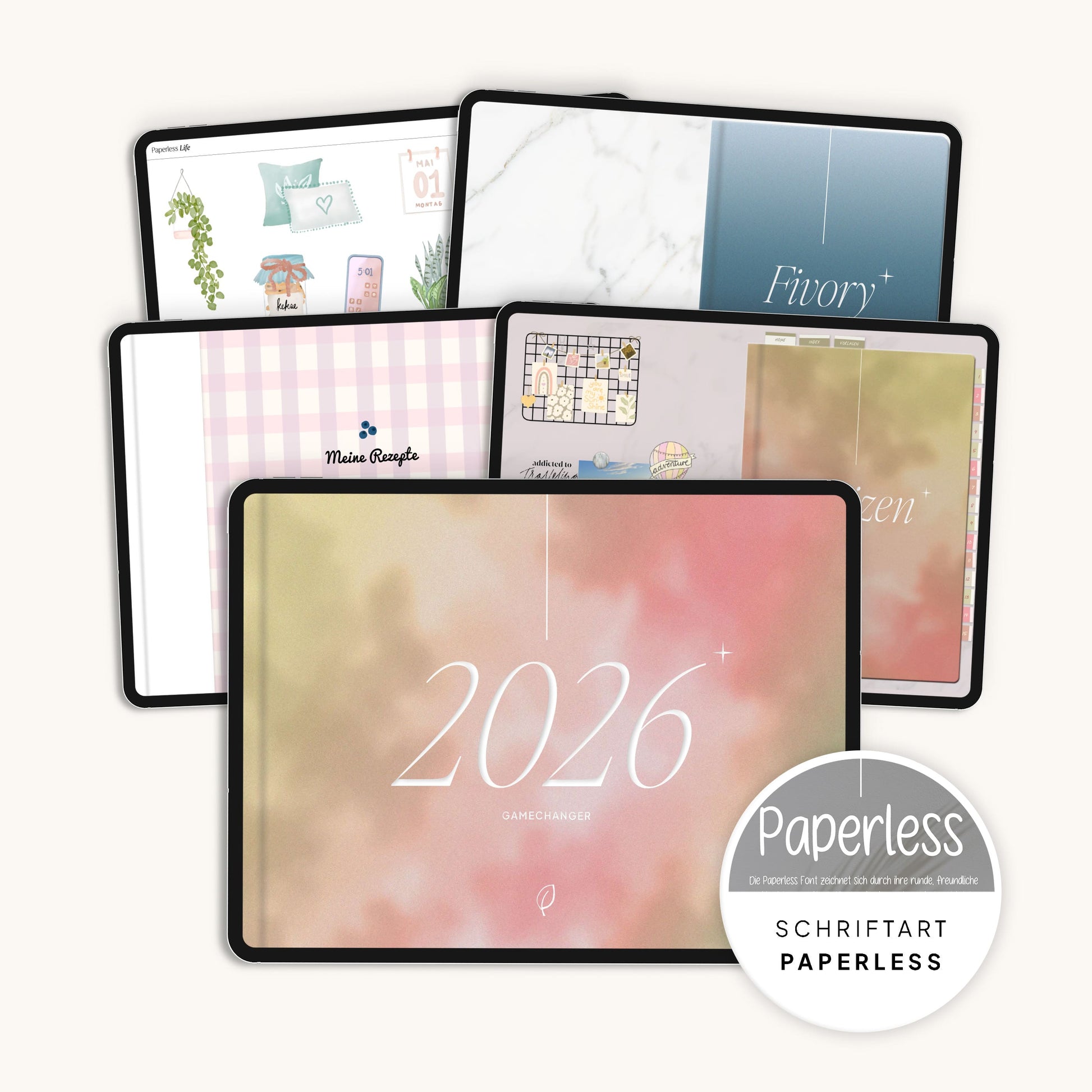 Starte stark ins Planungsjahr mit dem Gamechanger Planer 2026 und dem passenden Notizbuch – perfekt aufeinander abgestimmt. Die Paperless-Font sorgt für einheitliche, professionelle Notizen. Im digitalen Rezeptbuch behältst du deine Lieblingsrezepte im Blick, und das Fivory begleitet dich ganze fünf Jahre lang bei Zielen und Reflexion. Mit den passenden Stickern bringst du Struktur und Stil in jeden digitalen Plan.