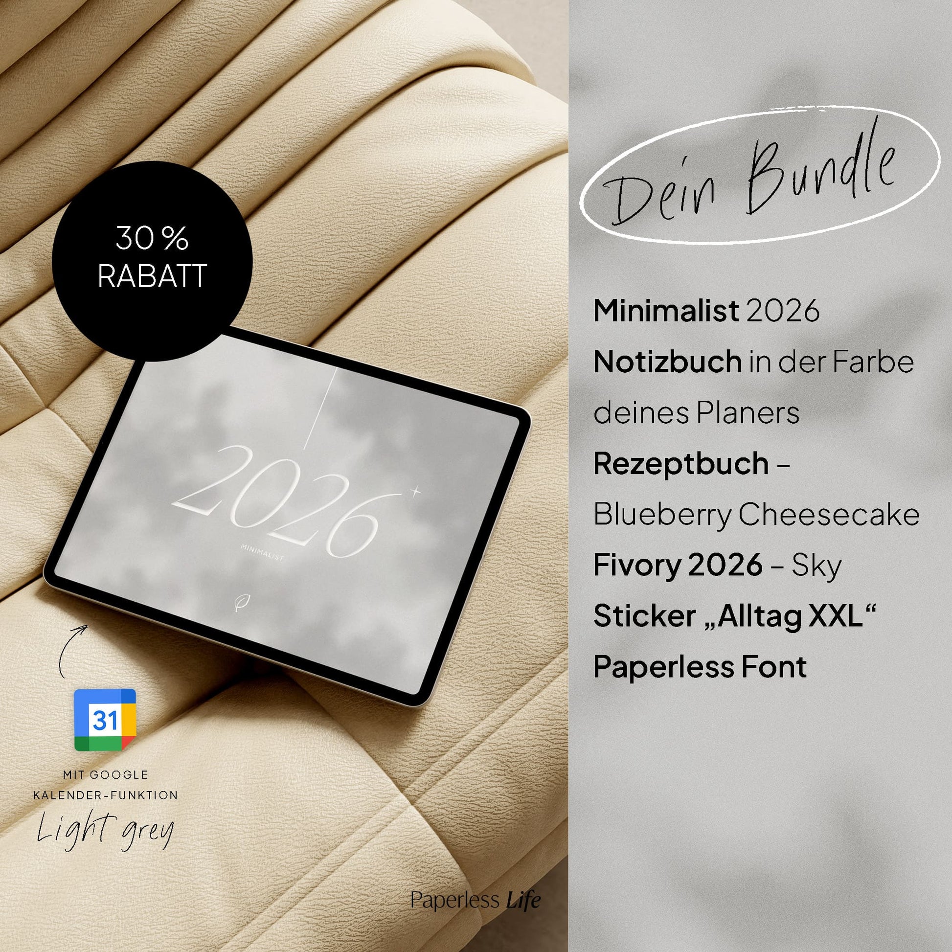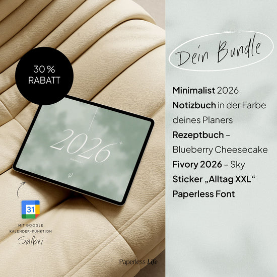 Starte durch mit dem minimalistischen Planer 2026 und dem passenden Notizbuch im cleanen Look. Mit dabei: unsere beliebte Paperless-Font für einheitliche, stilvolle Notizen. Im digitalen Rezeptbuch sammelst du deine Lieblingsrezepte – übersichtlich und jederzeit griffbereit. Das Fivory begleitet dich gleich fünf Jahre lang bei deiner Planung. Und mit den passenden Stickern gibst du allem den letzten Feinschliff.