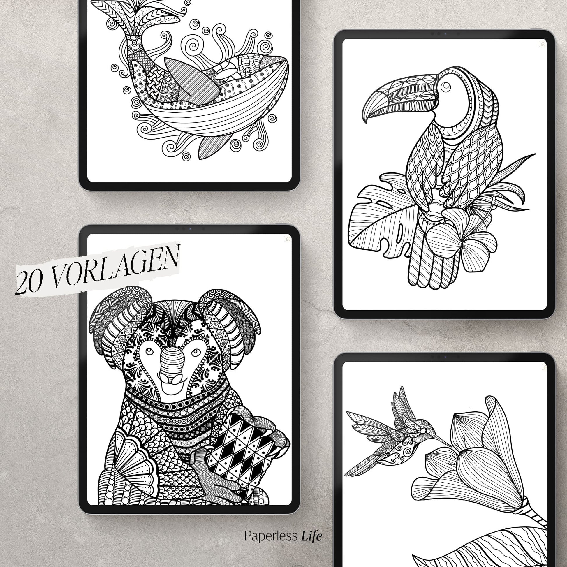 Die 20 handgezeichneten Zentangle-Malvorlagen bieten abstrakte Kunst mit wiederholenden Mustern, die sowohl Spaß machen als auch zur Entspannung beitragen. Alles, was du brauchst, ist ein iPad/Tablet und einen passenden Stift – und schon kannst du loslegen!